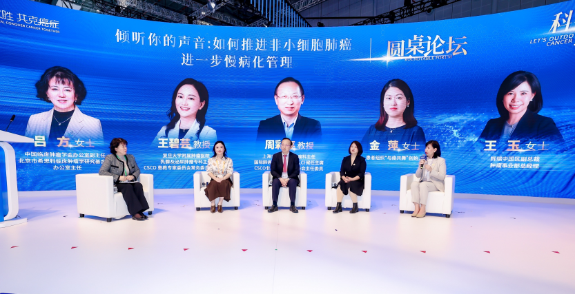活动现场,CSCO常务理事、CSCO NSCLC专委会主委、上海市东方医院肿瘤科主任周彩存教授,CSCO常务理事、CSCO青委会主委、CSCO患教专家委员会秘书长王碧芸教授,“与癌共舞”创始人金萍女士和辉瑞中国区副总裁、肿瘤事业部总经理王玉女士共同参与的圆桌论坛环节对患者版《指南》如何助力推进肺癌进一步“慢病化”管理展开了深入探讨。