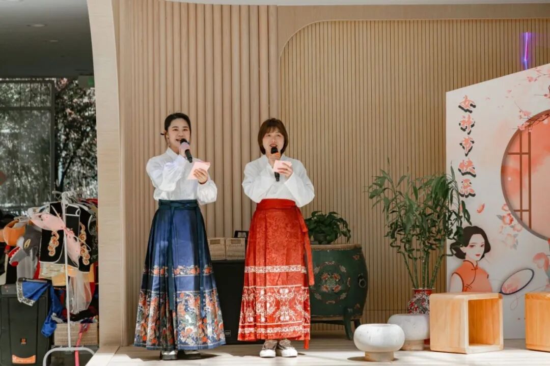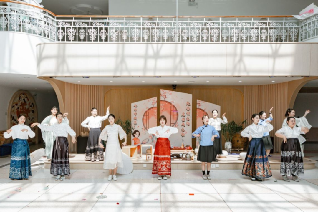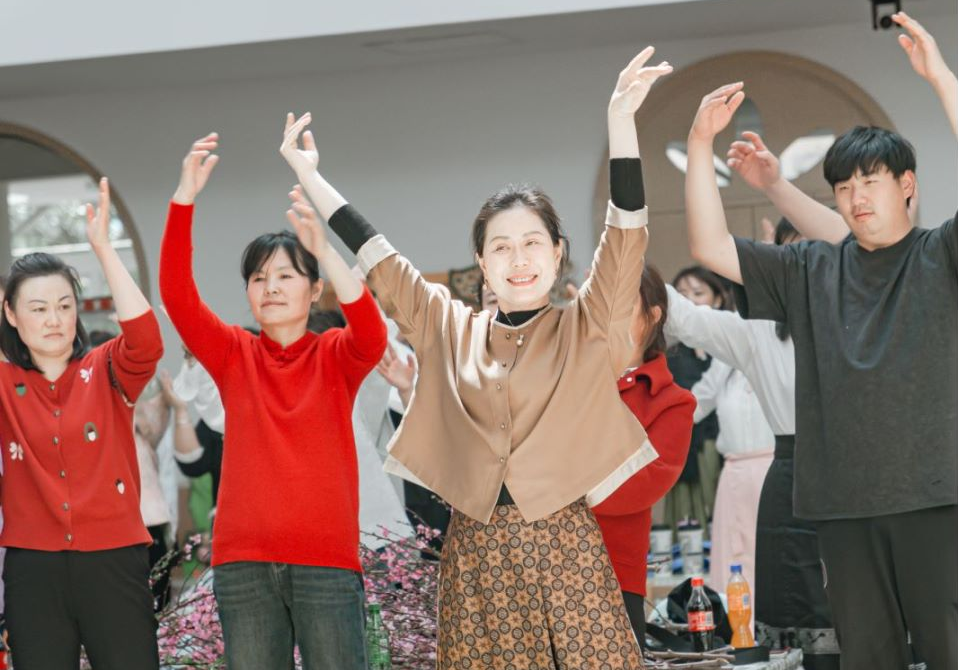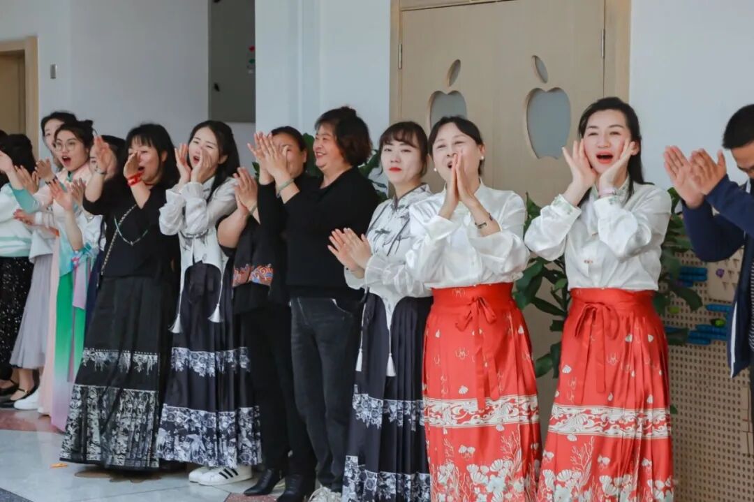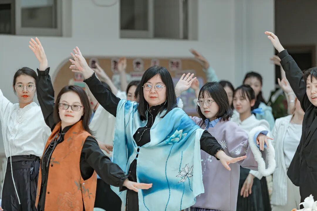 追梦新时代,巾帼绽芳华。一首《上春山》,巧妙化用14首古诗词,尽显春天妩媚,尽展春日“笑意”。老师们身着汉服,巧笑盼兮,齐跳国风韵味十足的暖场舞。