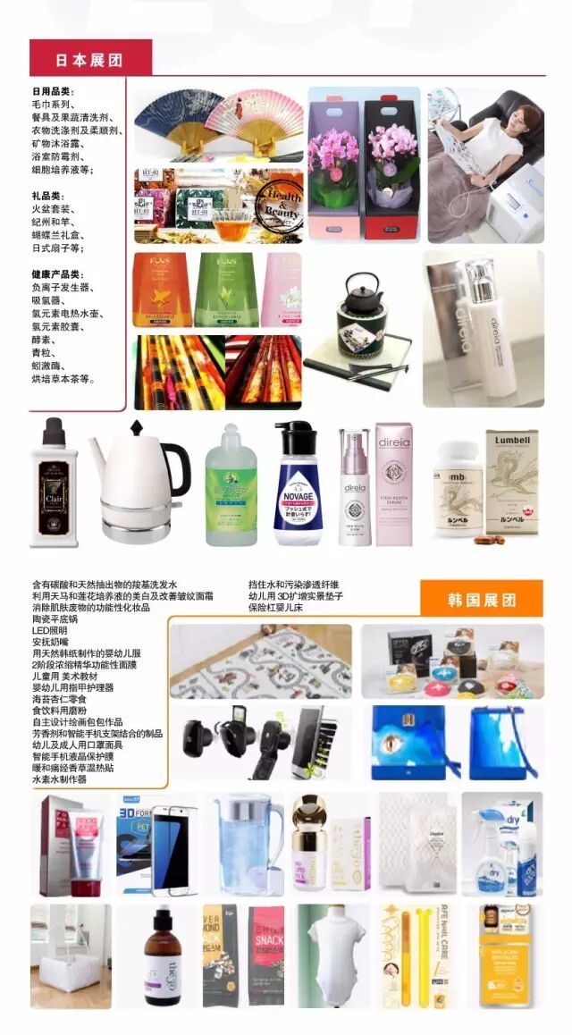 韩国展团带来的产品有:含有碳酸和天然抽出物的羧基洗发水、利用天马和莲花培养液的美白及改善皱纹面霜、消除肌肤污垢的功能性化妆品、睡眠面膜、陶瓷平底锅、3D手机保护膜、多功能安抚奶嘴、儿童美术教材、婴幼儿指甲护理器、韩纸制作的婴幼儿服装、婴儿床等等。