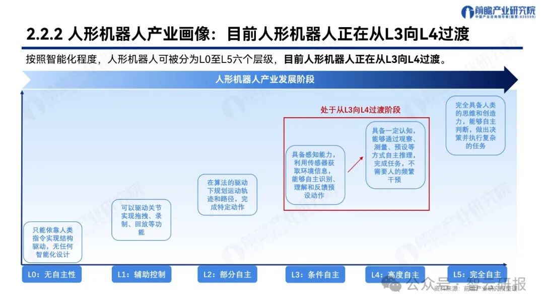 人形机器人产业已形成完整产业链,上游核心零部件价值量占比高,但部分关键部件制造难度大,依赖进口。 人形机器人智能化程度不断提升,正从L3向L4过渡,具身智能技术的发展使得人形机器人逐步实现自主感知、决策与行动。
