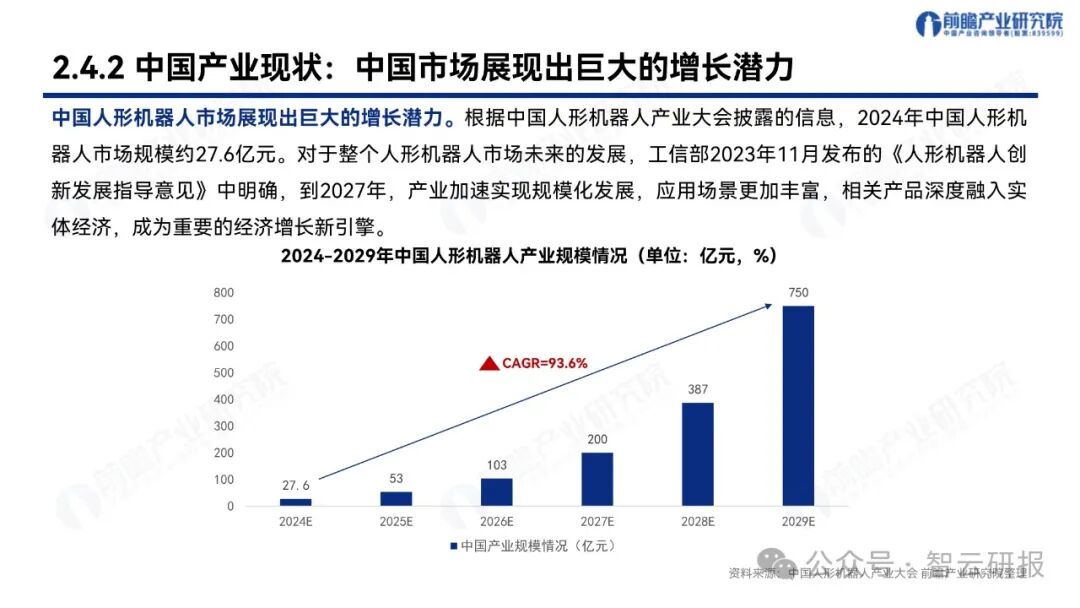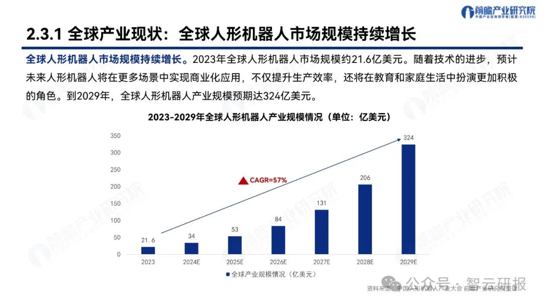 2024年中国人形机器人市场规模约27.6亿元,预计到2029年,全球人形机器人产业规模将达到324亿美元。 中国人形机器人市场增长迅速,且在全球市场中占据重要地位,预计到2027年,产业将加速实现规模化发展。