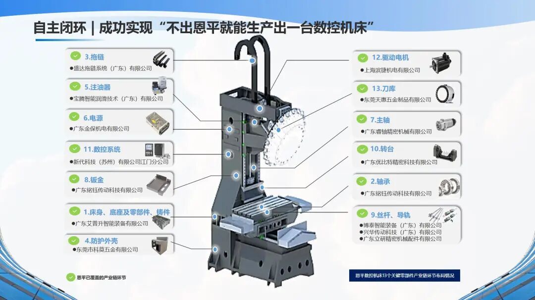 “此刻,站在这里,我的思绪不禁回到七年前,那时大槐聚集区还是一片工业待垦地。今天,这片土地厂房林立,已崛起成为产值突破50亿元的智造高地。”开幕式上,恩平市智能装备协会会长、广东艾普升智能装备有限公司董事长肖康利回忆起产业发展历程,感慨良多。近年来,恩平市抢抓省产业转移的机遇,聚焦高端装备制造产业实施“链式招商”。广东艾普升智能装备有限公司成为恩平市引进的第一家生产数控机床的智能装备制造企业,拉开了产业发展的序幕。在恩平市委市政府的大力培育扶持下,智能装备制造产业在恩州大地上一路“狂飙”,规上工业产值从2019年的3000万元跃升至2024年的51.6亿元,5年增长170倍。如今,智能装备制造产业已成为恩平市第一大战略性新兴产业,全链集聚上下游企业120多家,环环紧扣、相映生辉,一台数控机床13个主要零部件可全部本地化生产及配套,实现不出恩平就能生产一台数控机床。今年年初,恩平市数控机床招商经验作为全省唯一县市典型案例被省政府总结推广。