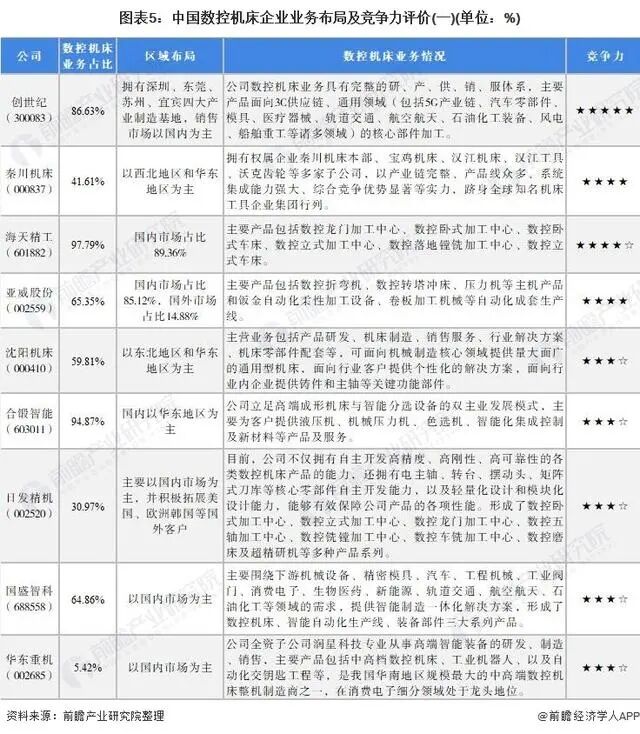 国内机床上市公司可以分为机床整机和零部件两大类,其中整机类公司包括创世纪、秦川机床、海天精工、亚威股份、沈阳机床、合锻智能、日发精机、国盛智科、华东重机、浙海德曼、宇晶股份、宇环数控、恒而达、华辰装备、青海华鼎、科德数控、华明装备、华东数控、中航高科、山东威达和上机数控等;核心零部件类,华中数控在数控系统优势明显,埃斯顿以机床伺服系统起家,昊志机电主要业务为主轴和转台,机床刀具类公司包括华锐精密、欧科亿等。