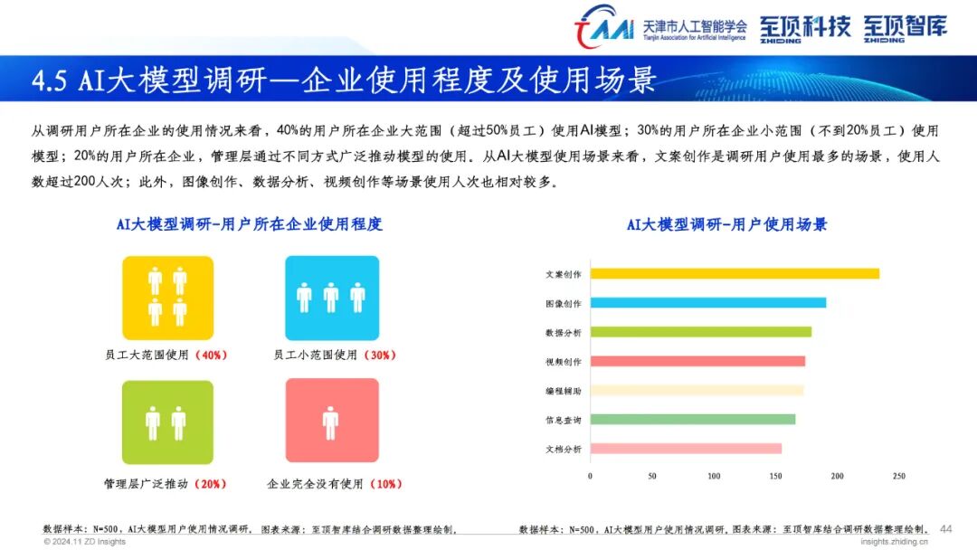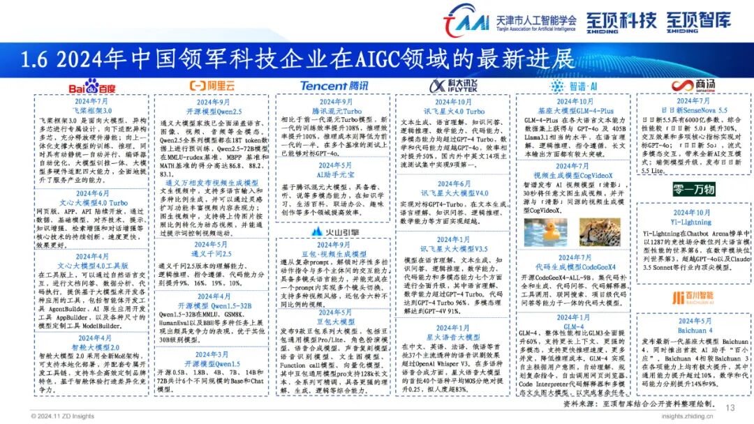 2024年,生成式AI已全面进入应用规模化推广,探索新场景和商业模式的新发展阶段。伴随AI大模型的普及程度不断加深,AIGC产业发展重点从去年关注度最高的模型层向场景应用层转变。AIGC为营销、传媒、金融、医疗、教育、娱乐、办公、制造、科学发现等多个领域带来前所未有的变革。搭载大模型的AI PC、AI手机、智能汽车相继推出,为用户带来更加便捷的使用体验。此外,具身智能也成为今年关注度颇高的领域,未来AI模型与人形机器人将密切融合,产生更多应用场景与商业机会。