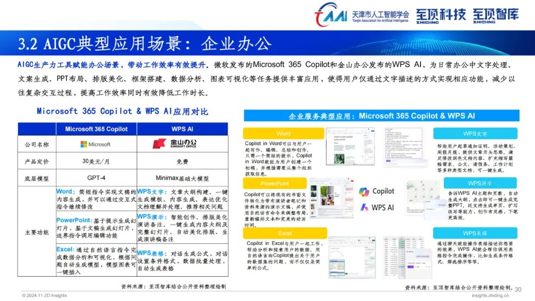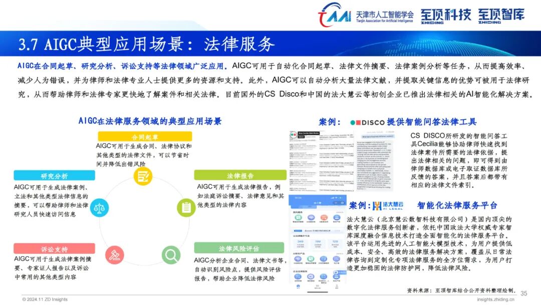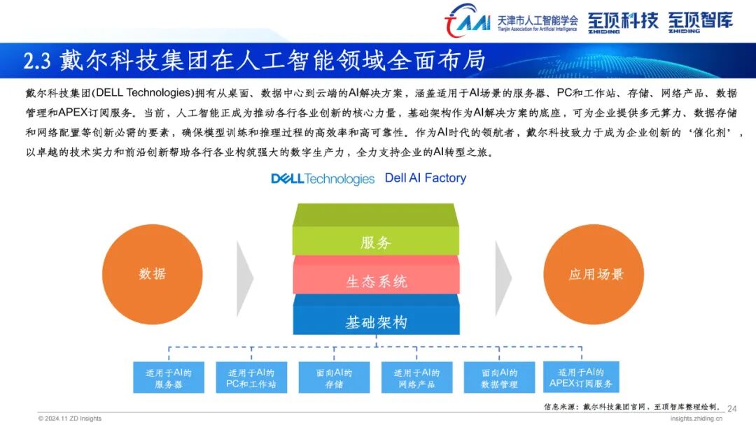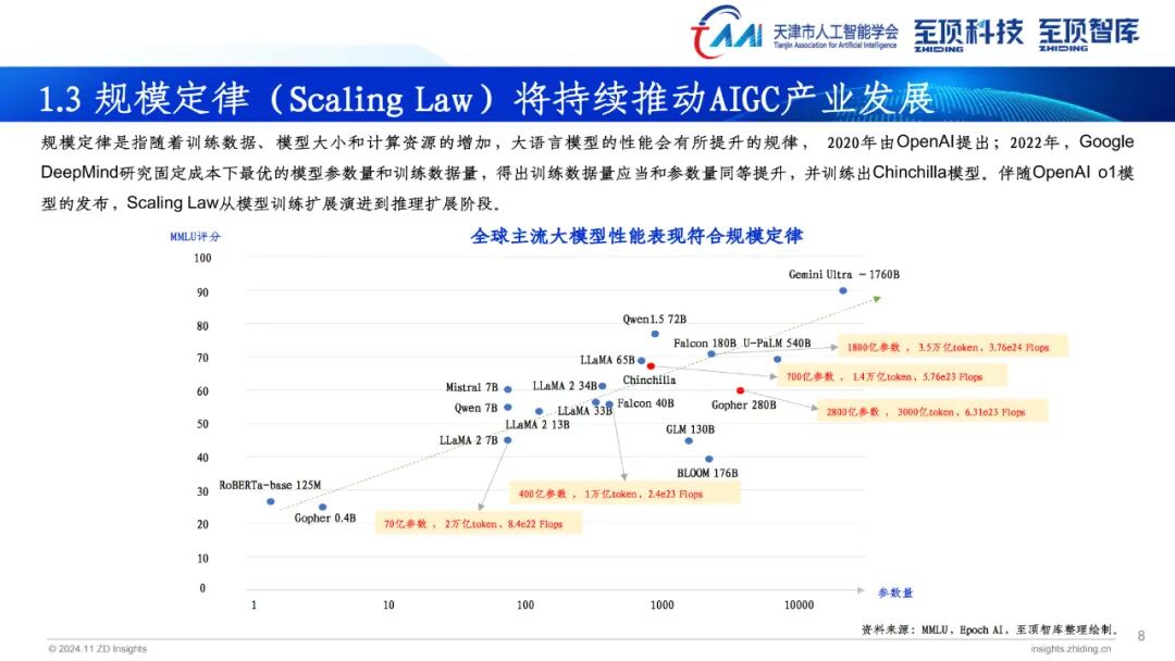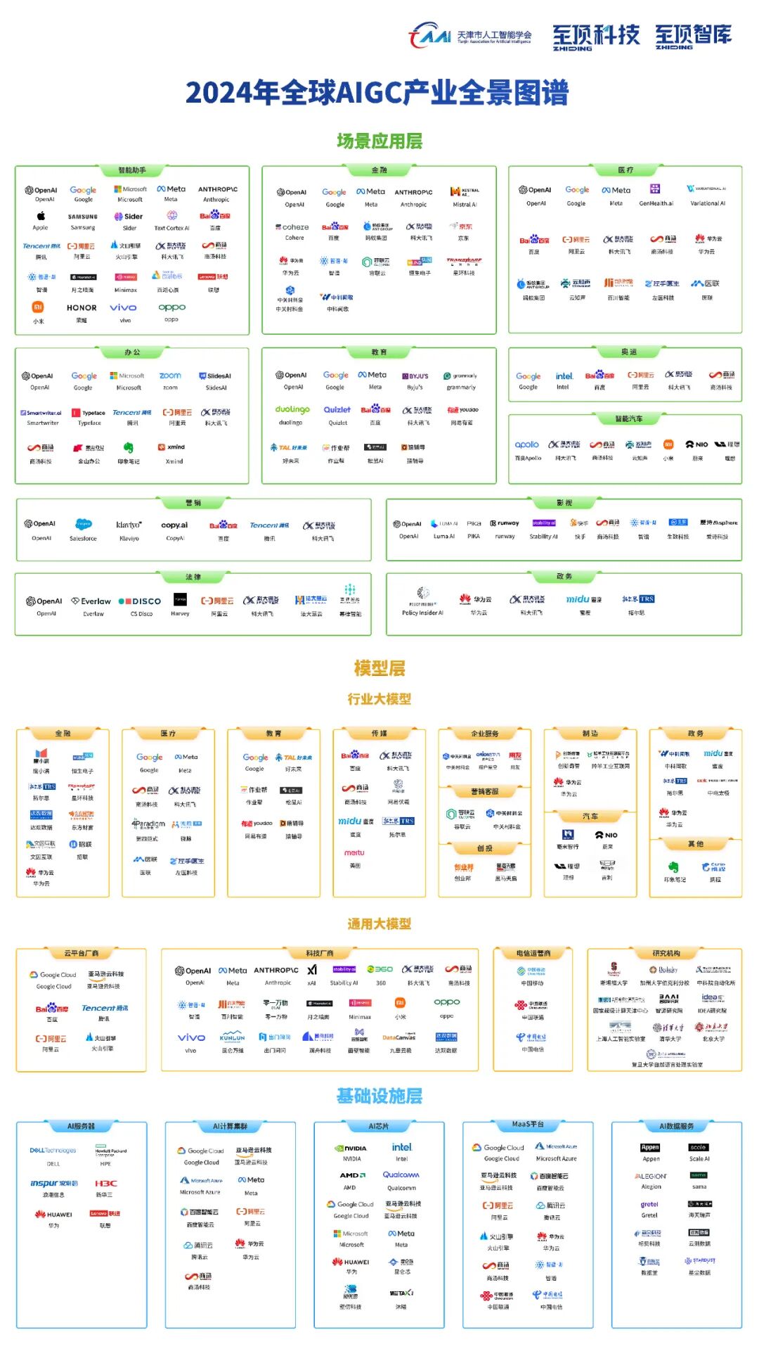 据介绍,《2024年全球AIGC产业全景图谱》主要分为三层,即基础设施层(AI服务器、AI计算集群、AI芯片、MaaS平台、AI数据服务);模型层(通用大模型、行业大模型);场景应用层(智能助手、金融、医疗、办公、教育、奥运、智能汽车、营销、影视、法律、政务)。图谱中涉及各领域全球代表性企业和相关机构,为读者提供更为详实的参考信息。