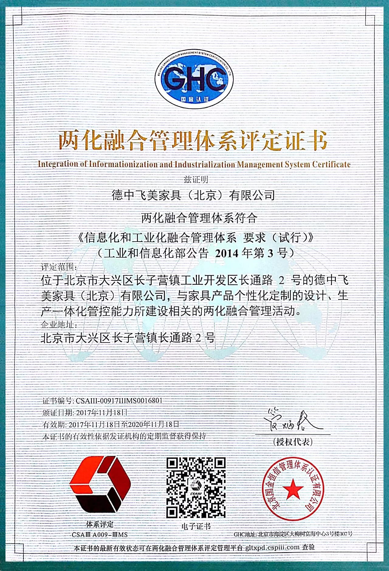飞美家具按照两化融合管理体系认真组织开展工作,于2017年11月18日正式通过两化融合管理体系评定,获得证书。