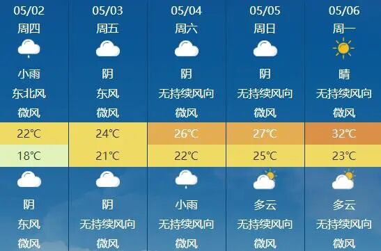 ◆ 今天,“五一”国际劳动节。我市仍有中雨,局部大雨,并伴有雷电。需要注意的是,昨夜新一股冷空气的先头部队渗透而至,今天其主力军陆续抵达,城区最高气温降至23℃,夜晨最低气温大概19℃。明天,我市气温进一步回落,城区最高气温22℃左右,夜晨最低气温仅18℃。