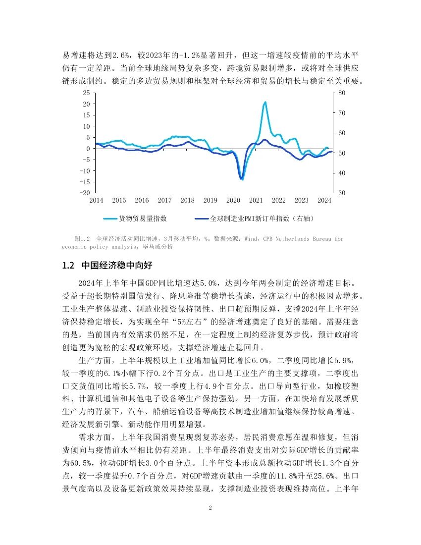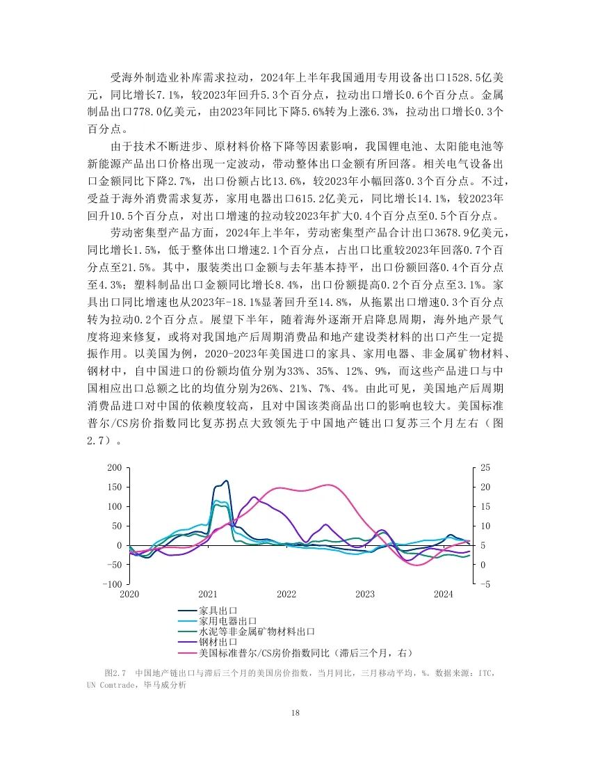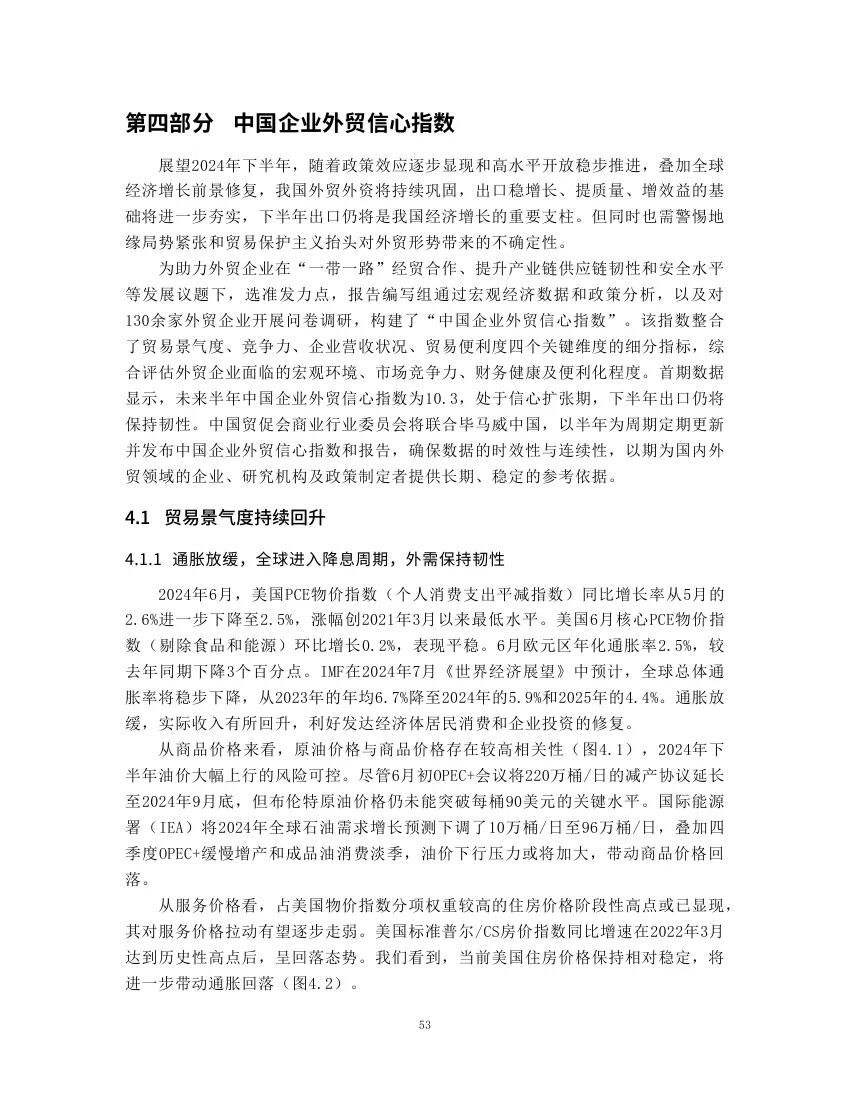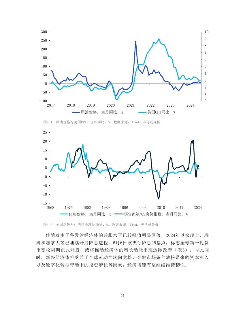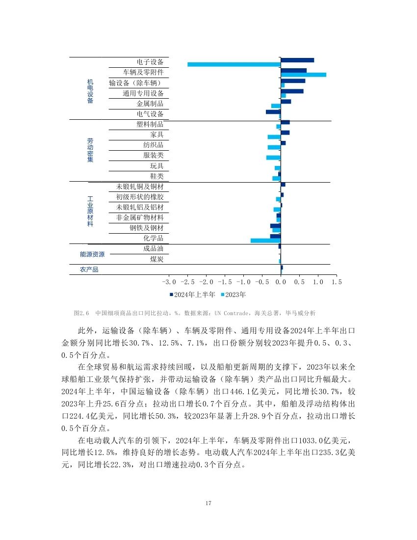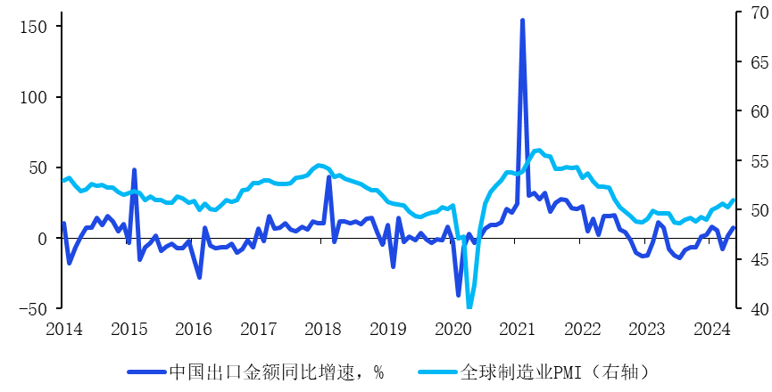 第一,贸易景气度持续回升,中国企业出口势头旺盛。2024年上半年,各发达经济体的通胀水平已较峰值明显回落,部分国家已开始降息,全球新一轮货币宽松周期正式开启,而新兴经济体则将受益于全球流动性转向宽松、金融市场条件放松带来的资本流入以及数字化转型带动的投资增长等因素,经济增速有望继续维持韧性。同时,从过去4轮周期的经验来看,全球制造业PMI的上行周期一般持续2年左右,这意味着2024年下半年全球制造业PMI继续保持上行的可能性较大。此外,在政策引领和市场环境变化的背景下,出海正成为中国企业挖掘第二增长曲线的重要突破口。