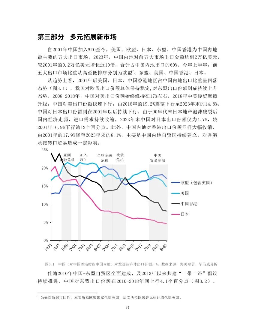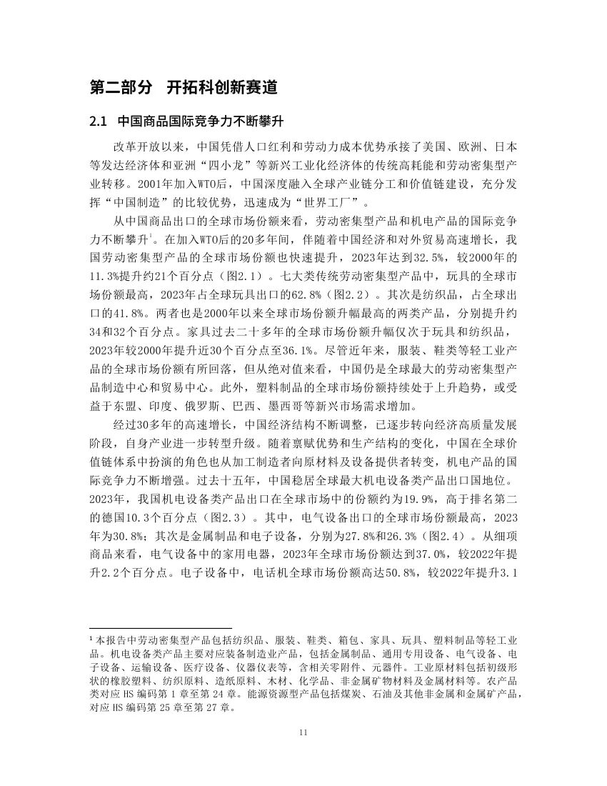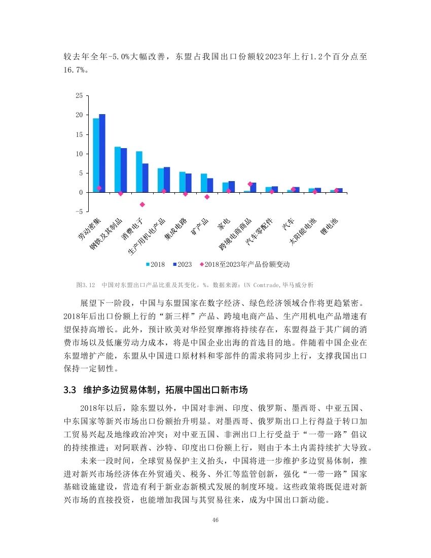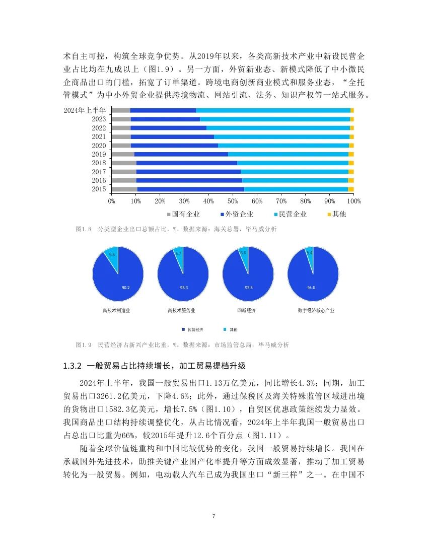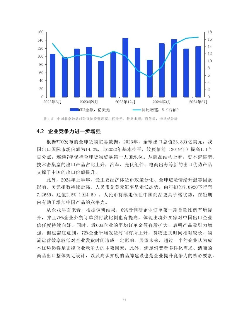 第二,中国企业出口竞争力进一步增强。根据WTO发布数据,中国连续7年保持全球货物贸易第一大国地位,其中汽车、光伏组件、电商出海等新的出口优势产品支撑了中国的出口份额提升。此外,人民币持续走低也让中国的商品更具价格优势,在短期内有助于增加中国产品的竞争力。从报告调研结果来看,69%受调研企业订单第一期首款比例有所提升,78%企业外贸订单预付款比例也有提高,体现出境外买家对中国出口企业信任度持续向好。同时,近60%企业的平均订单金额有所扩大,表明产品吸引力增强。展望未来,超过一半的企业认为成本优势仍将是支撑企业竞争力的主要因素。
