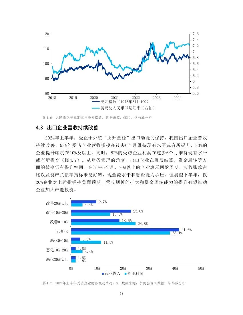 第三,出口企业营收持续改善。2024年上半年,受益于外贸“质升量稳”出口动能的保持,我国出口企业营收持续改善。报告调研结果显示,93%的受访企业营收规模在过去6个月维持现有水平或有所提升,33%的企业提升幅度在10%及以上。同时,82%的受访企业利润在过去6个月维持现有水平或有所提高。