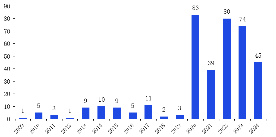 图:历年上半年新增货物出口干预措施数量,条。数据来源:Global trade alert,毕马威分析