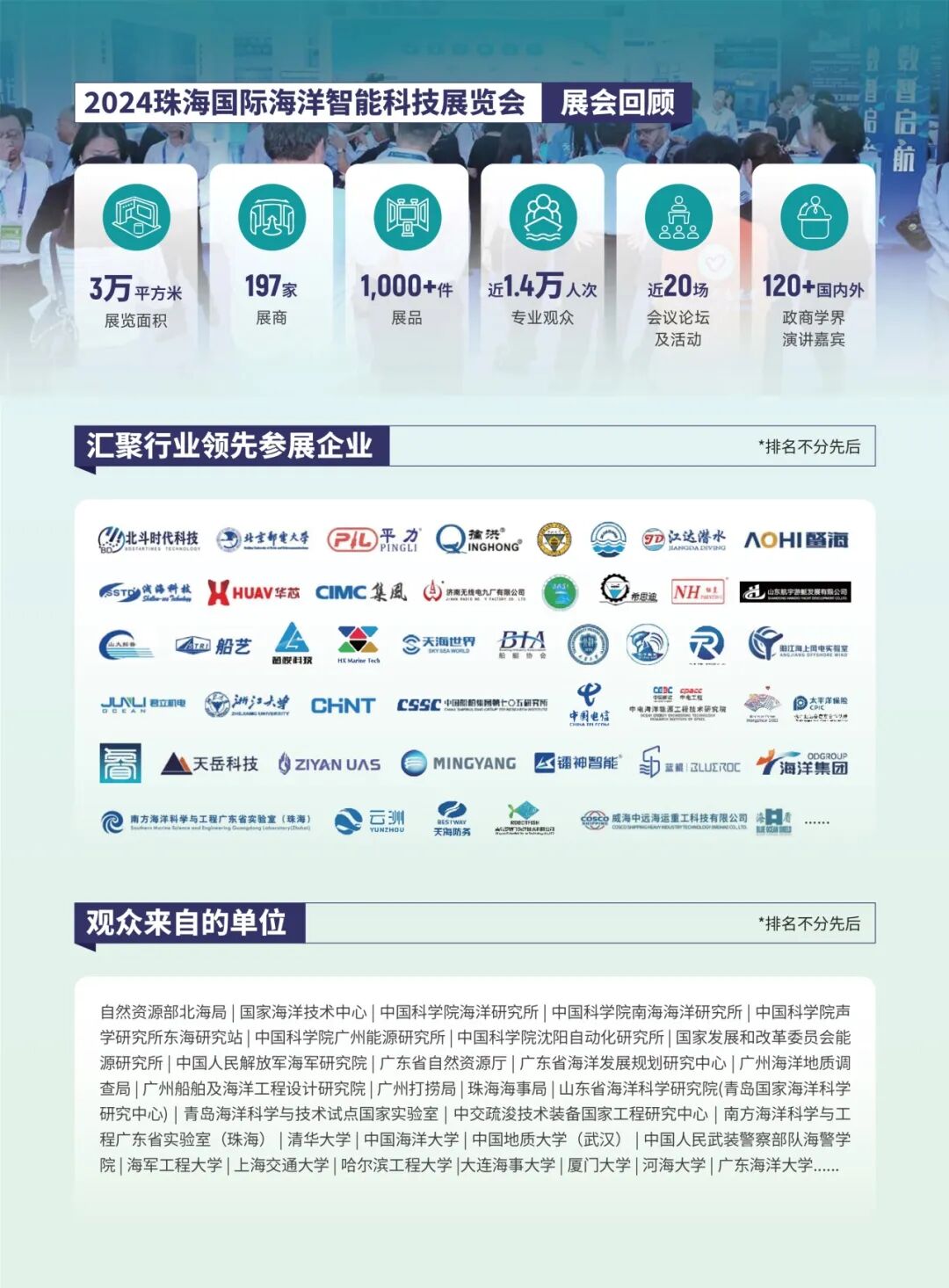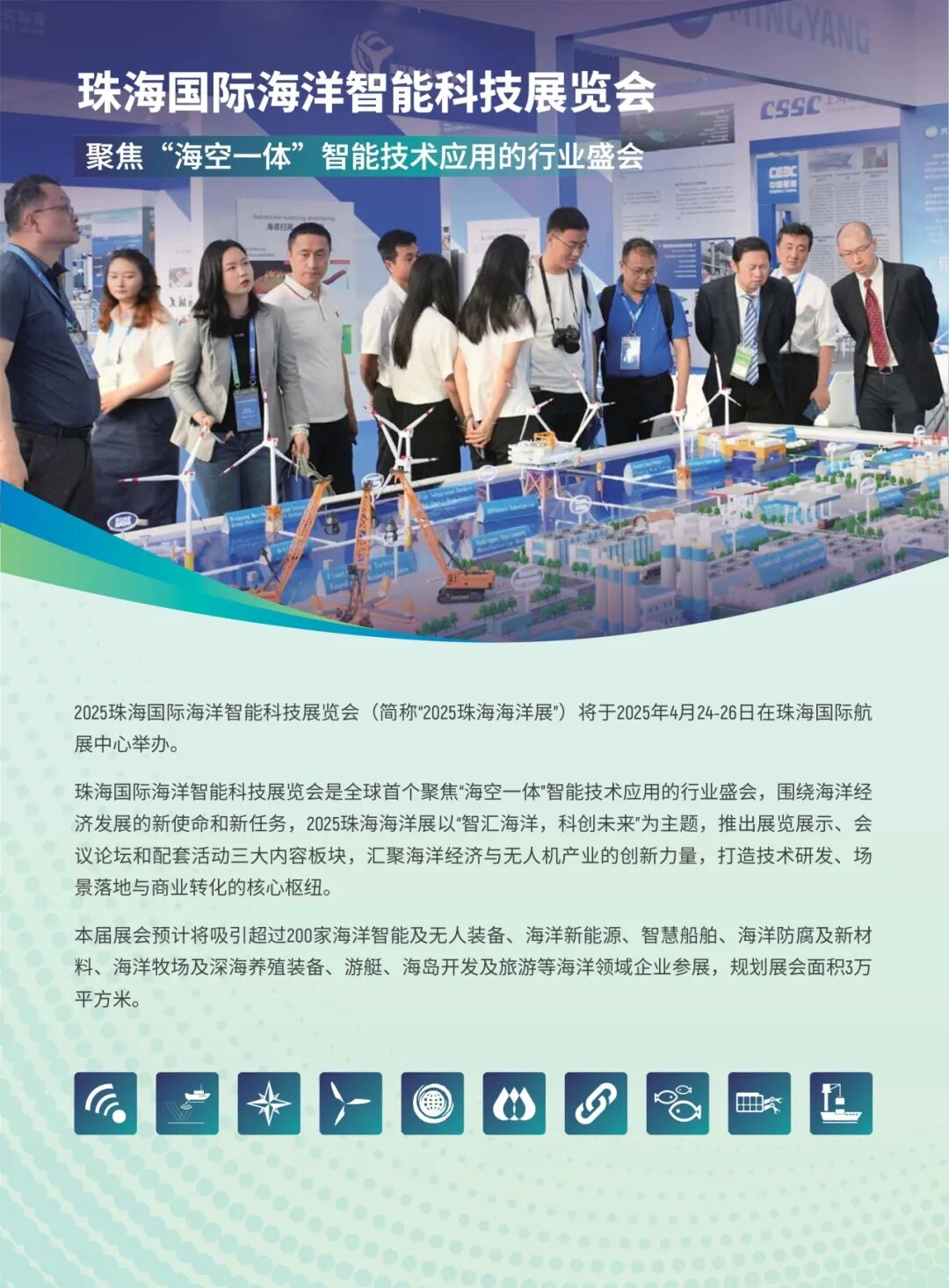 本届展会预计将吸引超过200家海洋智能及无人装备、海洋新能源、智慧船舶、海洋防腐及新材料、海洋牧场及深海养殖装备、游艇、海岛开发及旅游等海洋领域企业参展,规划展会面积3万平方米。