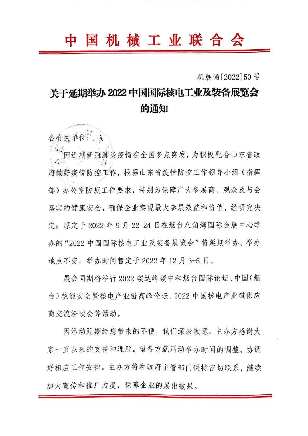 关于延期举办"2022中国国际核电工业及装备展览会"的通知