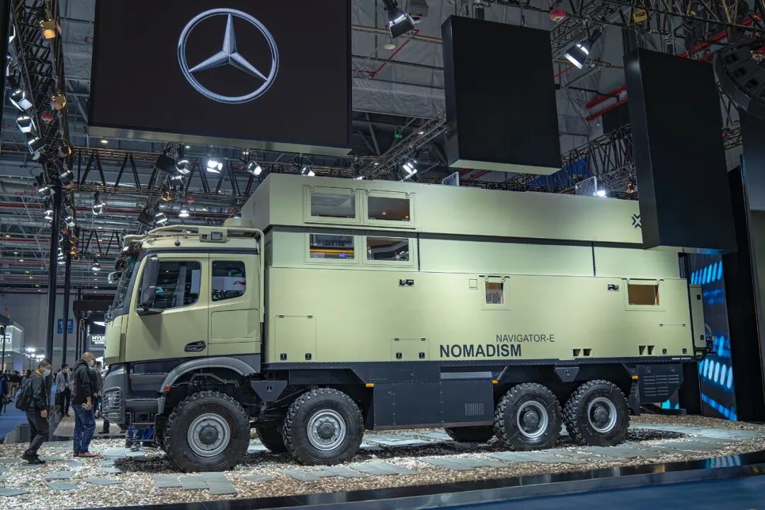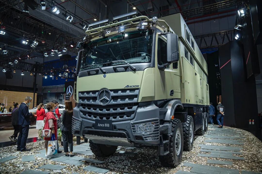 在整个进博会汽车馆,最吸引人的就是这辆大奔驰了。这是基于梅赛德斯-奔驰8x8卡车底盘阿洛斯(Arocs)打造的全地形豪华旅居车。这款全驱车型无惧任何地形与环境,被参观者成为三室两厅的“移动之家”。