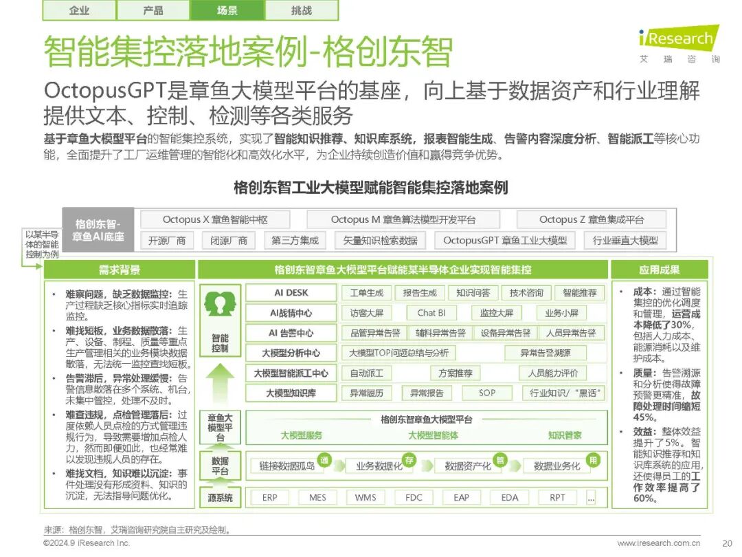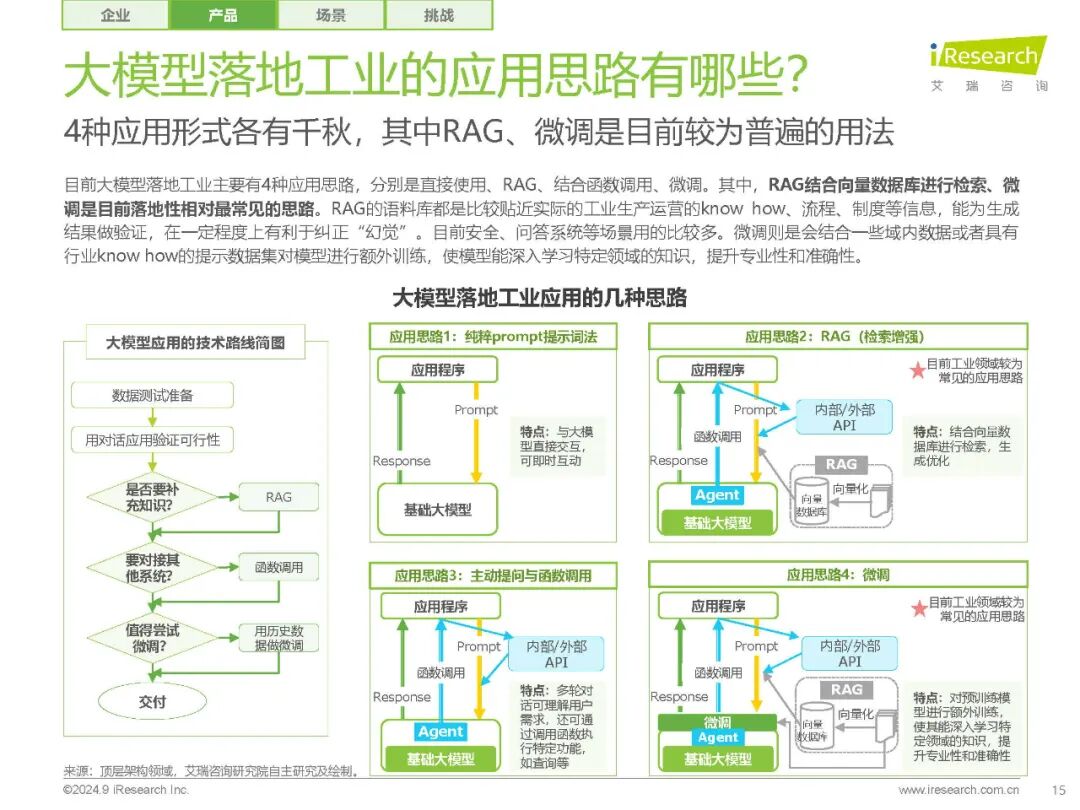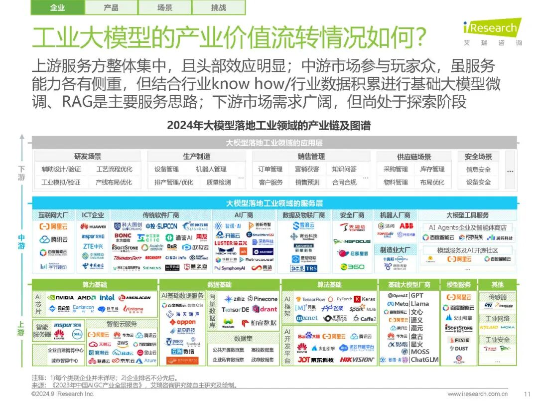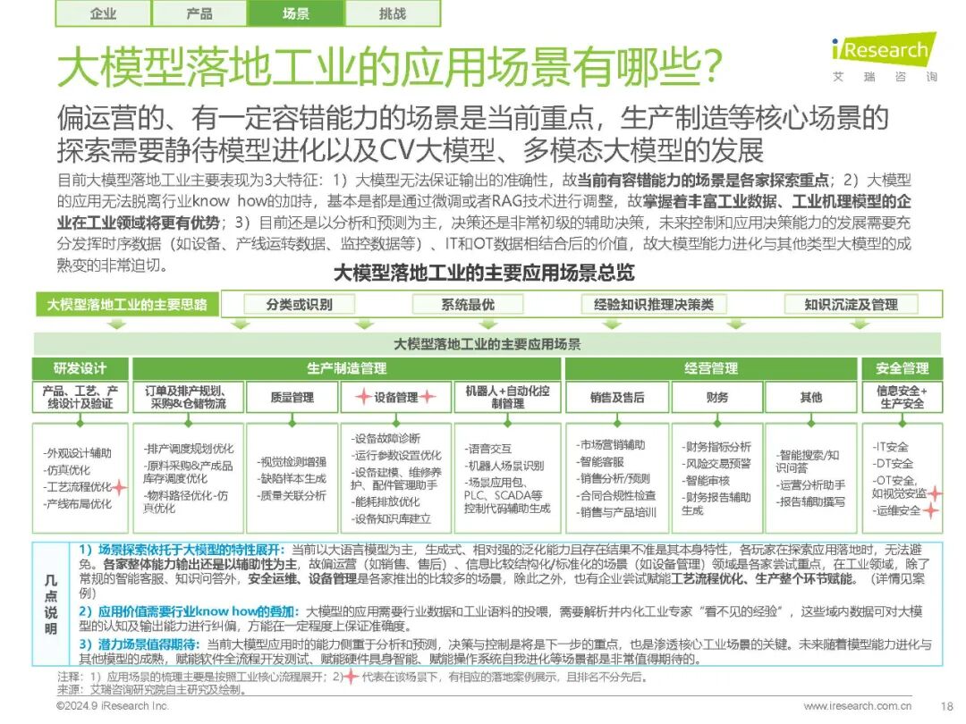 【工业大模型的应用场景】 工业大模型的应用场景广泛,从研发设计到生产制造,再到经营管理和安全服务,大模型技术都在发挥着重要作用。报告中指出,当前大模型的不可解释性和幻觉等特性,与工业“0容错”的特性相悖,因此当前大模型落地工业的探索更多聚焦于偏运营的、具有一定容错能力的场场景,如知识问答、辅助设计/代码生成等。
