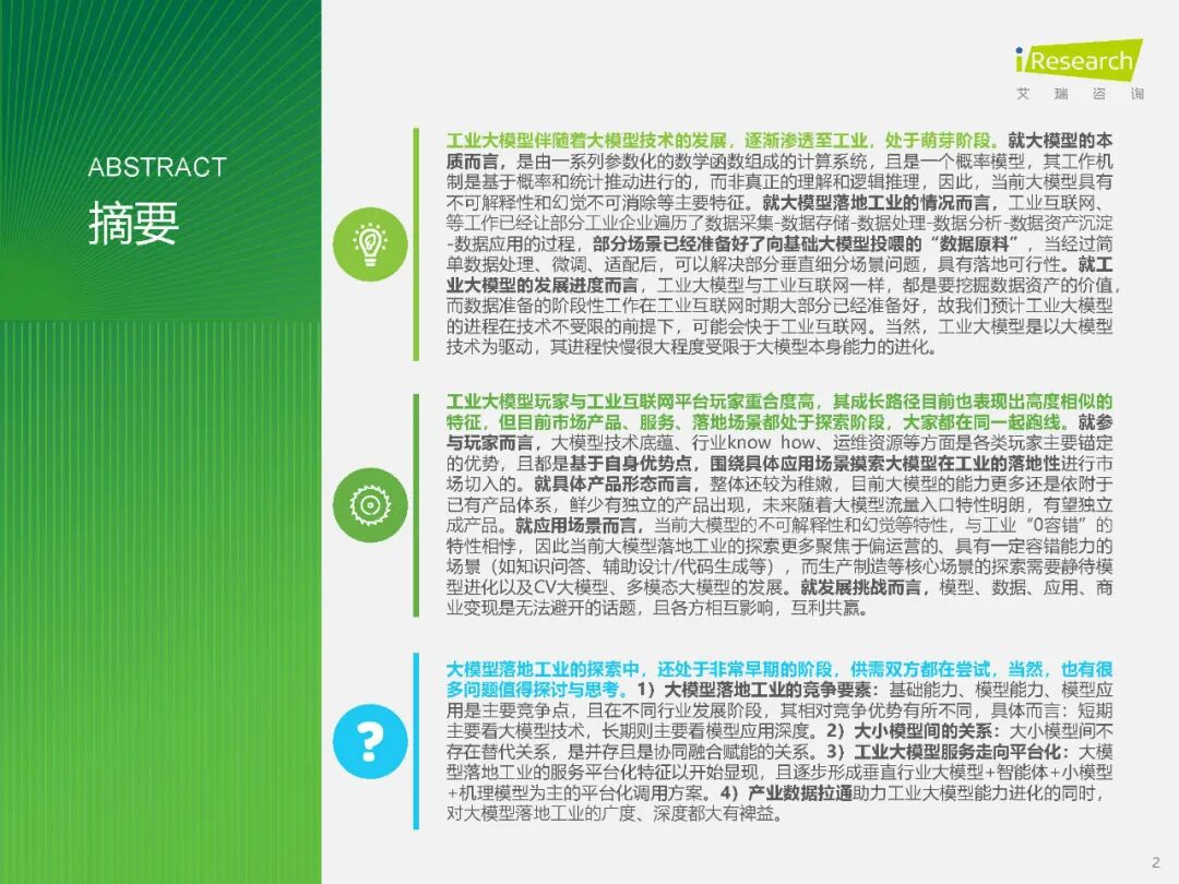 【数据的力量:工业大模型的竞争力】 报告强调,基础能力、模型能力、模型应用是工业大模型落地的主要竞争点。短期内,技术优势企业将占领先机;而长期来看,具备行业know how积累的企业有望后来居上。这一观点得到了业界专家的广泛认同,他们认为,技术和行业未来的竞争优势点可拆解为以下几个方向:大模型本身对工业知识的覆盖、推理能力、多模态能力情况以及输出结果的准确性。