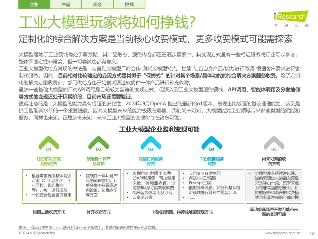 【平台化:工业大模型服务的新趋势】随着工业大模型的逐渐推进,平台化服务将成为新的趋势。报告中提到,垂直行业大模型+智能体+小模型+机理模型为主的平台化调用方案将成为主流。这种平台化服务不仅能够减少定制化工作,还能提升智能协同能力,为工业领域带来更高效的解决方案。