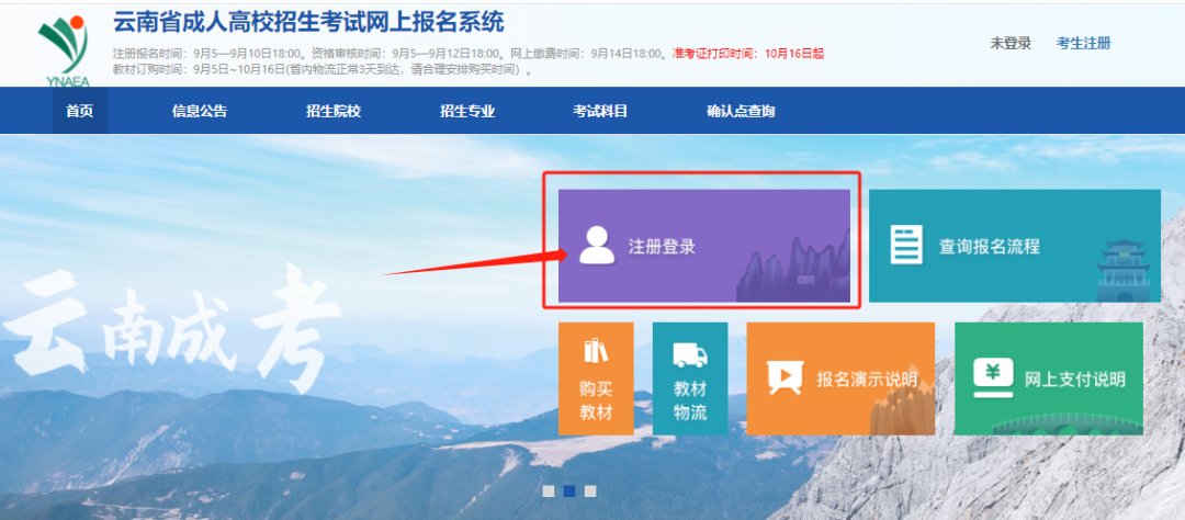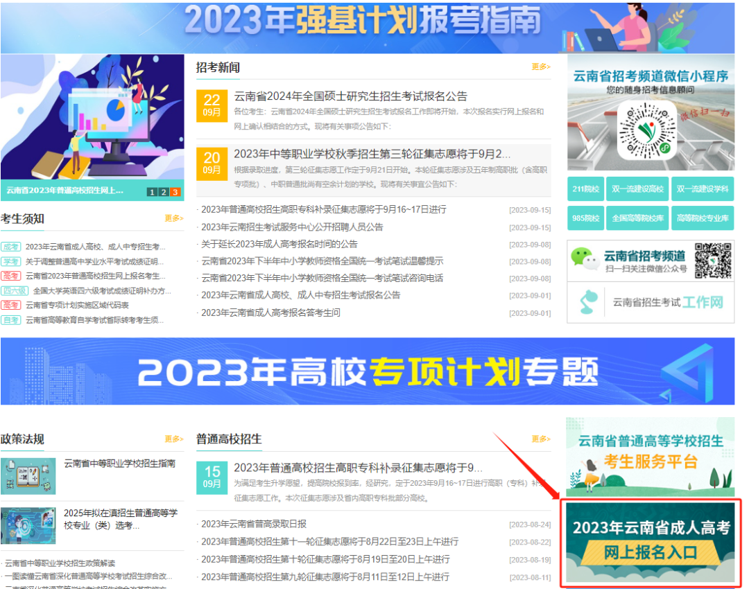 2023年云南省成人高等学校招生全国统一考试将于10月21-22日举行,准考证打印时间为2023年10月16日起,考生可登录云南省招生考试院网站打印准考证。因2023年准考证打印入口暂未开通,且历年准考证打印流程均无较大变动,同学们先参考2022年成人高考准考证打印流程,熟悉关键步骤:考生进入云南省招生考试院网站(https://www.ynzs.cn/),点击2023年云南省成人高考网上报名入口(提示:建议使用 360浏览器“极速模式”)。
