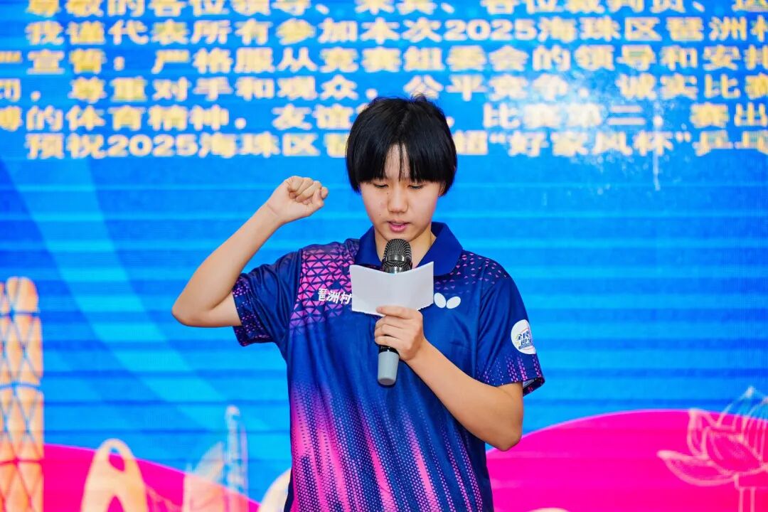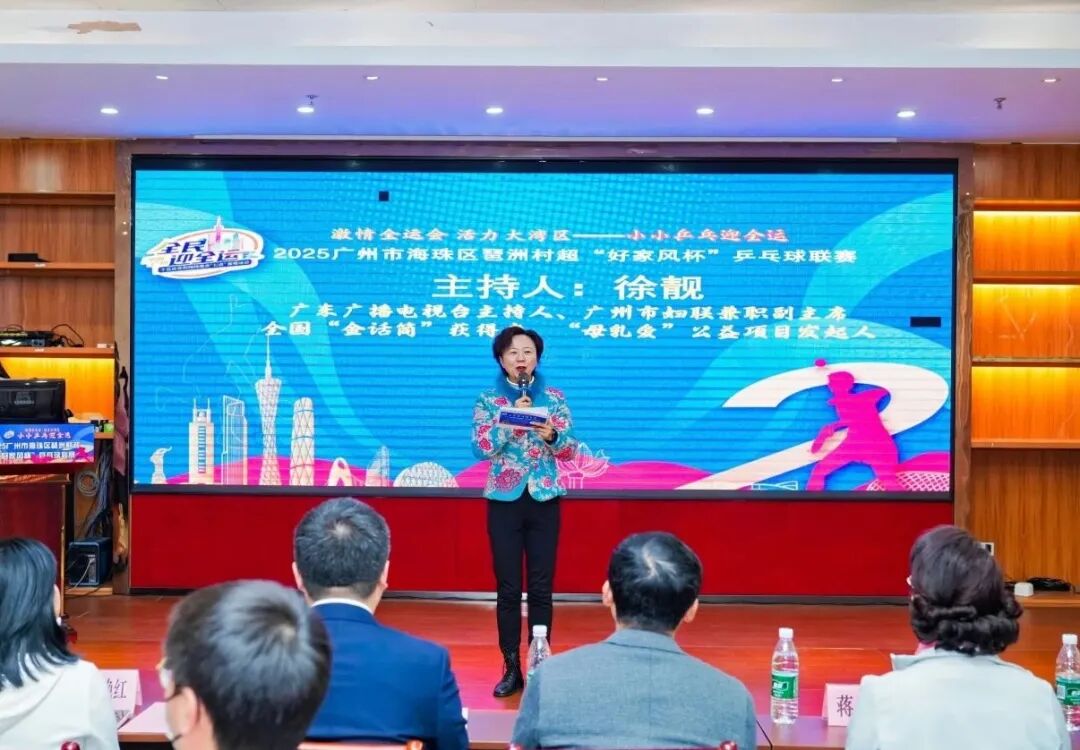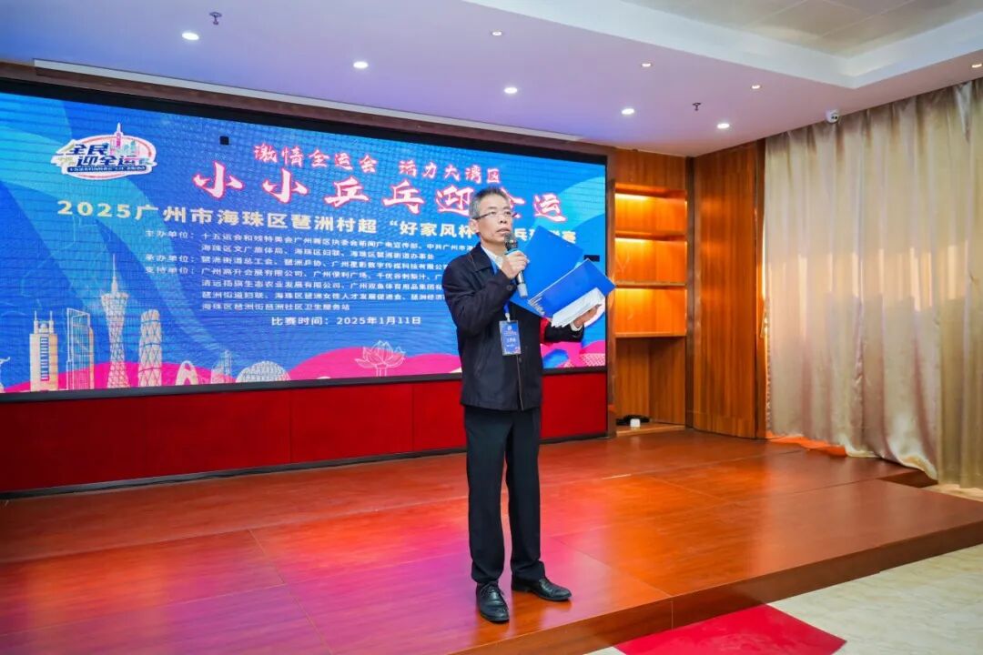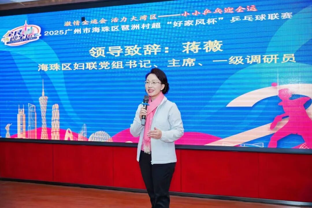 海珠区妇联党组书记、主席、一级调研员蒋薇表示,通过举办“好家风”杯村超乒乓球联赛,将体育活动与家风家教宣传相结合,向社区居民宣传好家风,倡导爱国爱家、相亲相爱、向上向善、共建共享的文明新风尚,使好家风在社区中得到传承和弘扬,促进家庭和谐与社区文明建设,带动海珠区家庭投身到城中村改造和百千万工程、社会综合治理工作中。蒋主席强调了赛事在弘扬好家风、推动全民运动、迎接体育盛会会等方面的重要意义,鼓励大家展现个人及家庭的风采。并表示,今年海珠区妇联将广泛开展群众性体育活动,为十五运会和残特奥会的到来营造良好的赛事氛围。