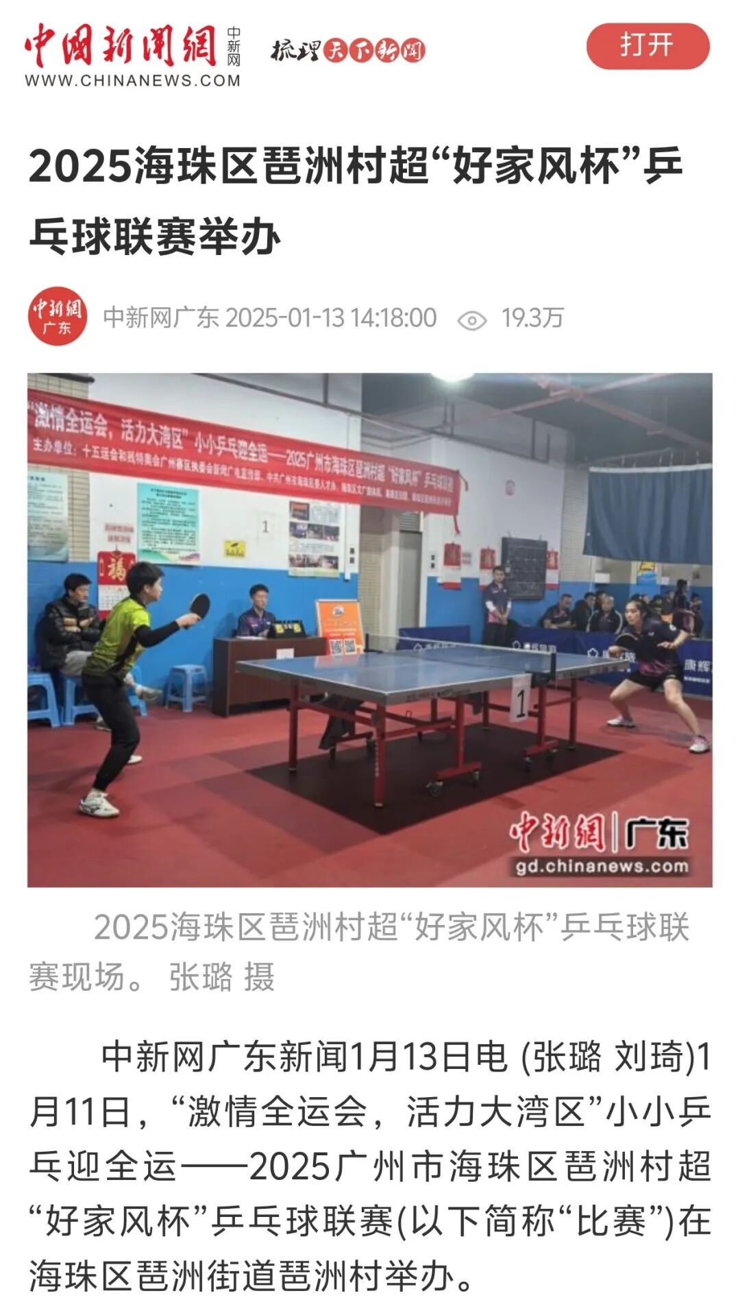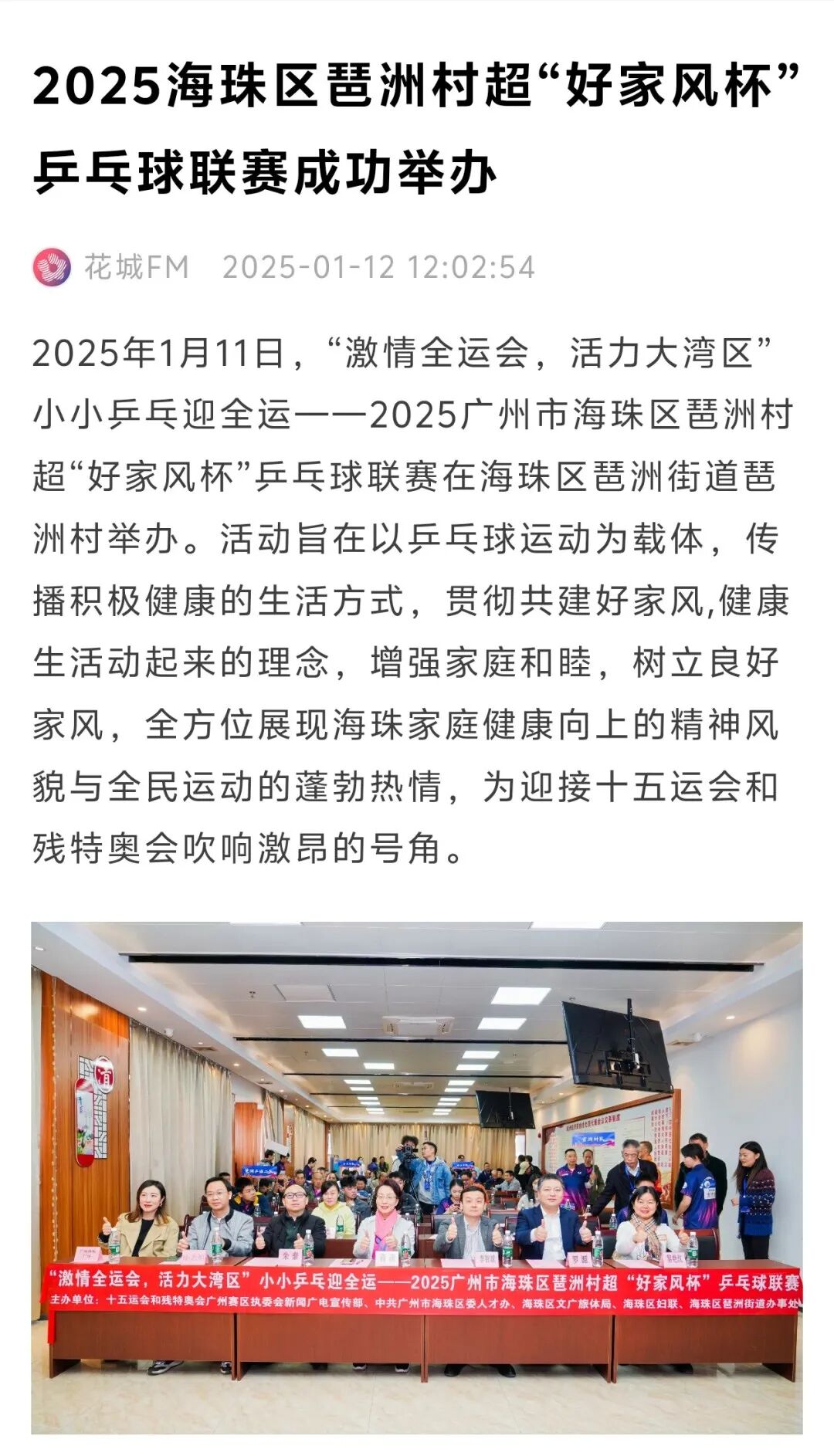 为深入贯彻“注重好家风、加强家风家教建设”的理念,落实“全民全运、全运惠民”的宗旨,做好群众性活动融入十五运会和残特奥会元素的工作要求,营造重视体育、支持体育、参与体育的浓厚社会氛围,推动全民健身事业高质量发展,2025年1月11日,“激情全运会,活力大湾区”小小乒乓迎全运——2025广州市海珠区琶洲村超“好家风杯”乒乓球联赛在海珠区琶洲街道琶洲村举办。
