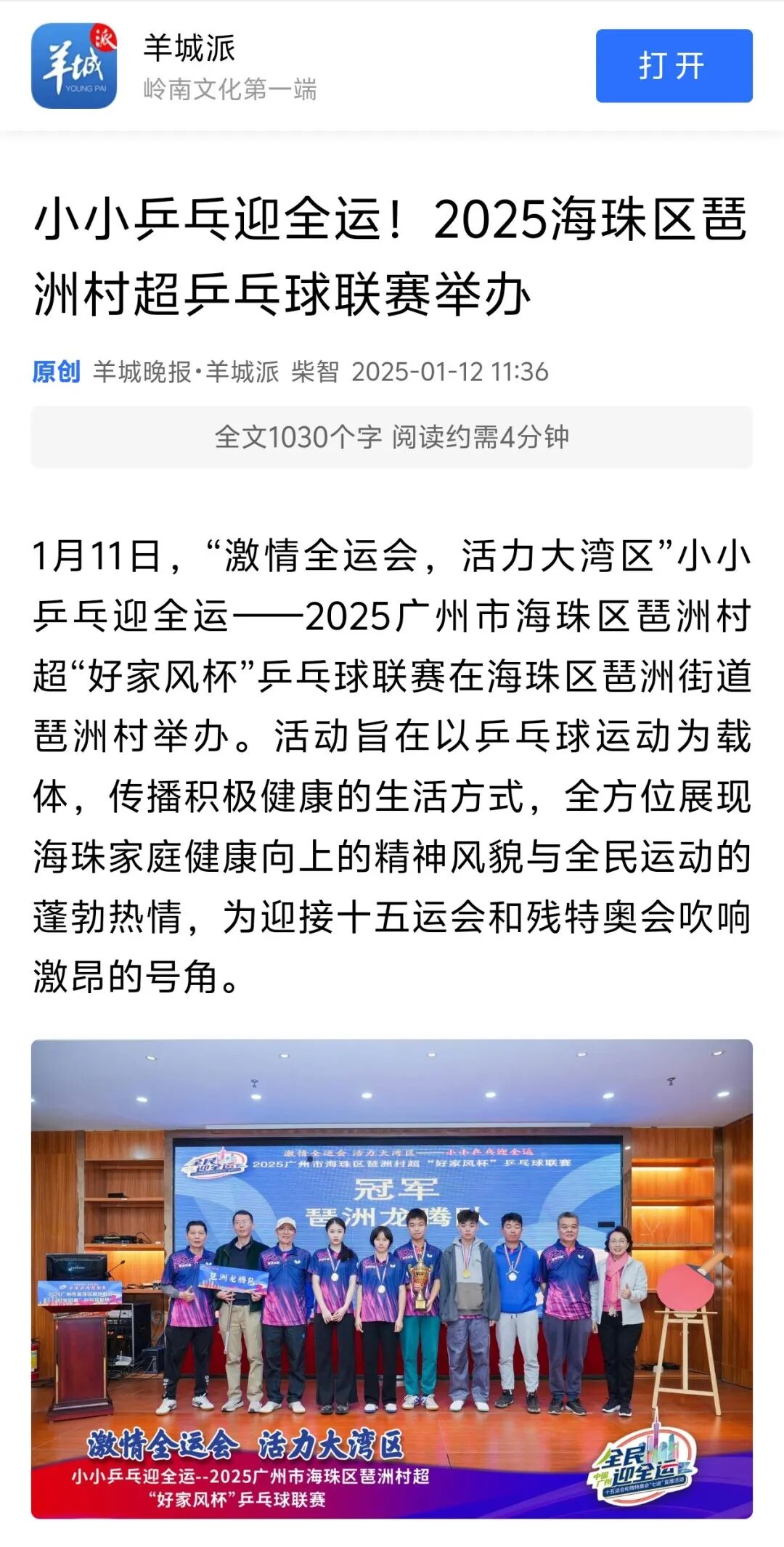 随着比赛的圆满落幕,“激情全运会,活力大湾区”小小乒乓迎全运——2025广州市海珠区琶洲村超“好家风杯”乒乓球联赛也画上了完美的句号。此次活动的成功举办,不仅为传递了健康向上的生活理念、良好的家风以及全民运动的精神,提升了广大群众对十五运会和残特奥运会的知晓率和参与度。还向大家展示了随着城中村改造和“百千万工程”的深入推进,作为广州城市发展缩影的琶洲村,近年来在环境美化、设施升级、文化传承等方面取得了显著成就。