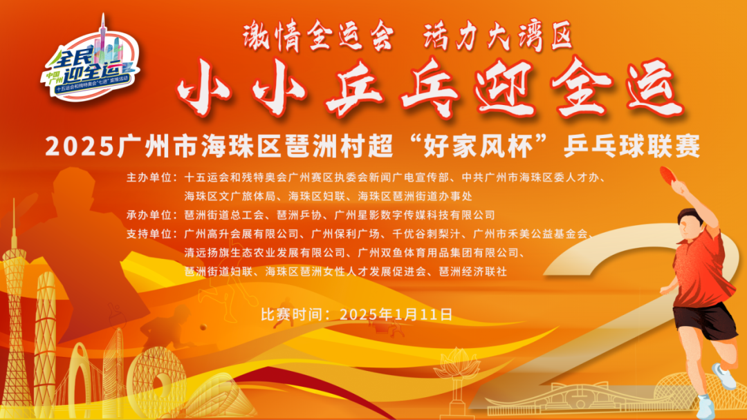 本次活动主办单位为十五运会和残特奥会广州赛区执委会新闻广电宣传部、中共广州市海珠区委人才办、海珠区文广旅体局、海珠区妇联、海珠区琶洲街道办事处,承办单位为琶洲街道总工会、琶洲乒协、广州星影数字传媒科技有限公司,支持单位为广州高升会展有限公司、广州保利广场、千优谷刺梨汁、广州市禾美公益基金会、清远扬旗生态农业发展有限公司、广州双鱼体育用品集团有限公司、琶洲街道妇联、海珠区琶洲女性人才发展促进会、琶洲经济联社、琶洲街琶洲社区卫生服务站。