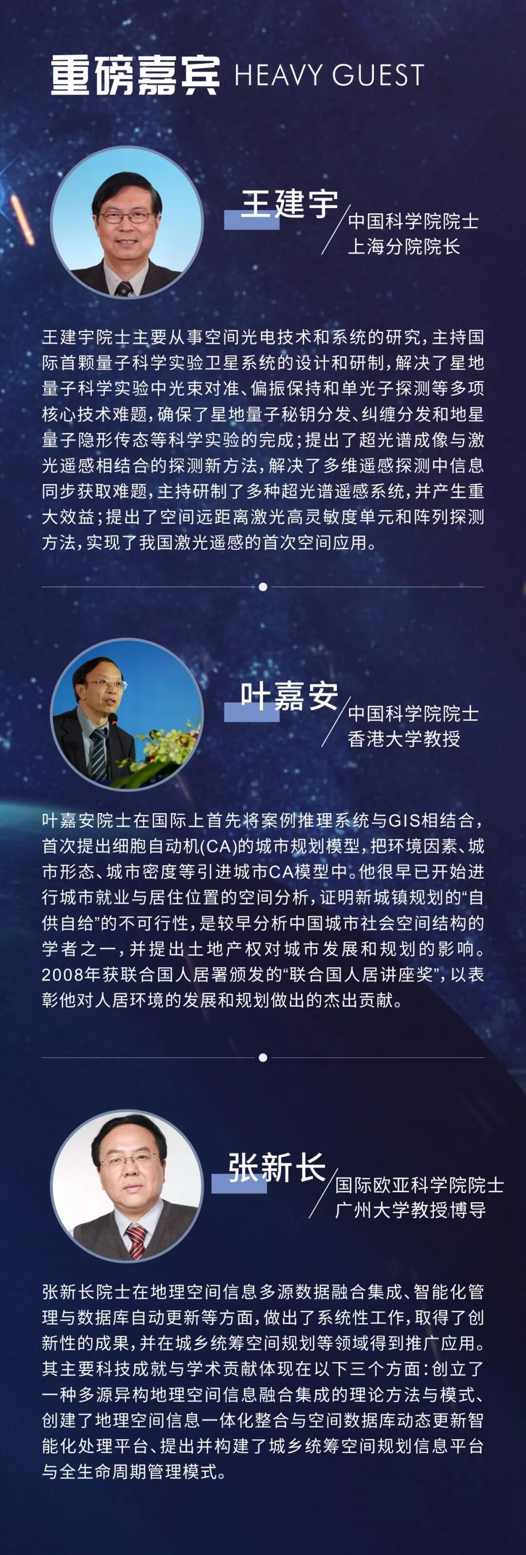 论坛将邀请政府领导、商业航天及物联网领域各界人士与会,更荣幸邀请到中国科学院院士王建宇、中国科学院院士叶嘉安、国际欧亚科学院院士张新长出席本次盛会,三大院士齐聚光明,将与政府领导、产业链上下游企业家、专业媒体等共同探讨卫星和物联网产业发展新趋势。