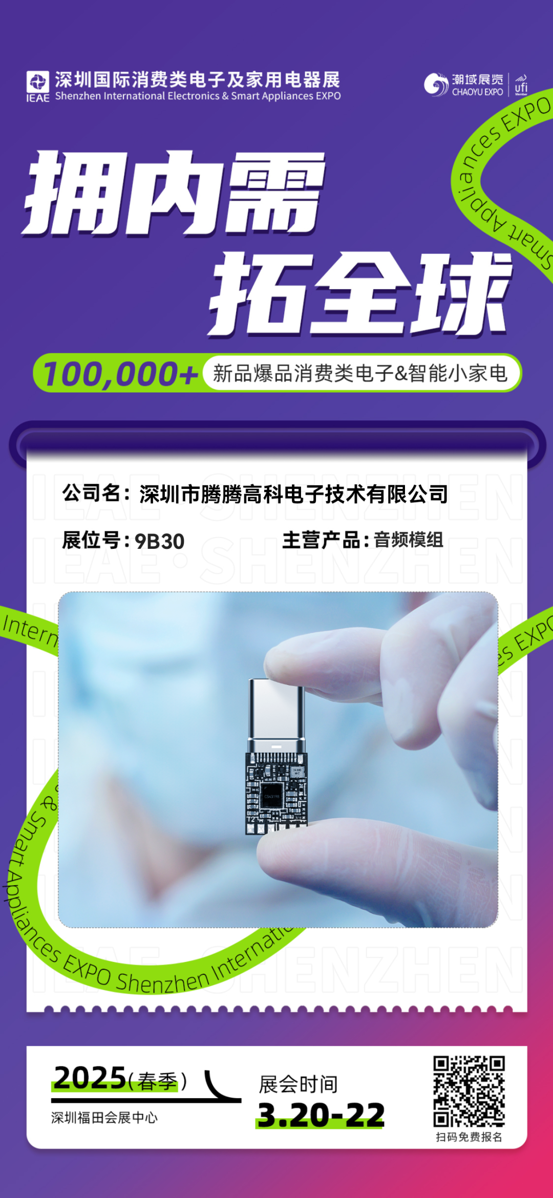 阳春三月,万物生长!腾腾高科诚邀您莅临2025IEAE深圳国际消费类电子及家用电器展,与我们共同开启一场科技与创新的盛宴。作为中国领先的消费电子与智能家电垂直领域B2B展会,IEAE展将汇聚全球顶尖品牌、行业专家及采购商,打造全产业链交流与合作的黄金平台。