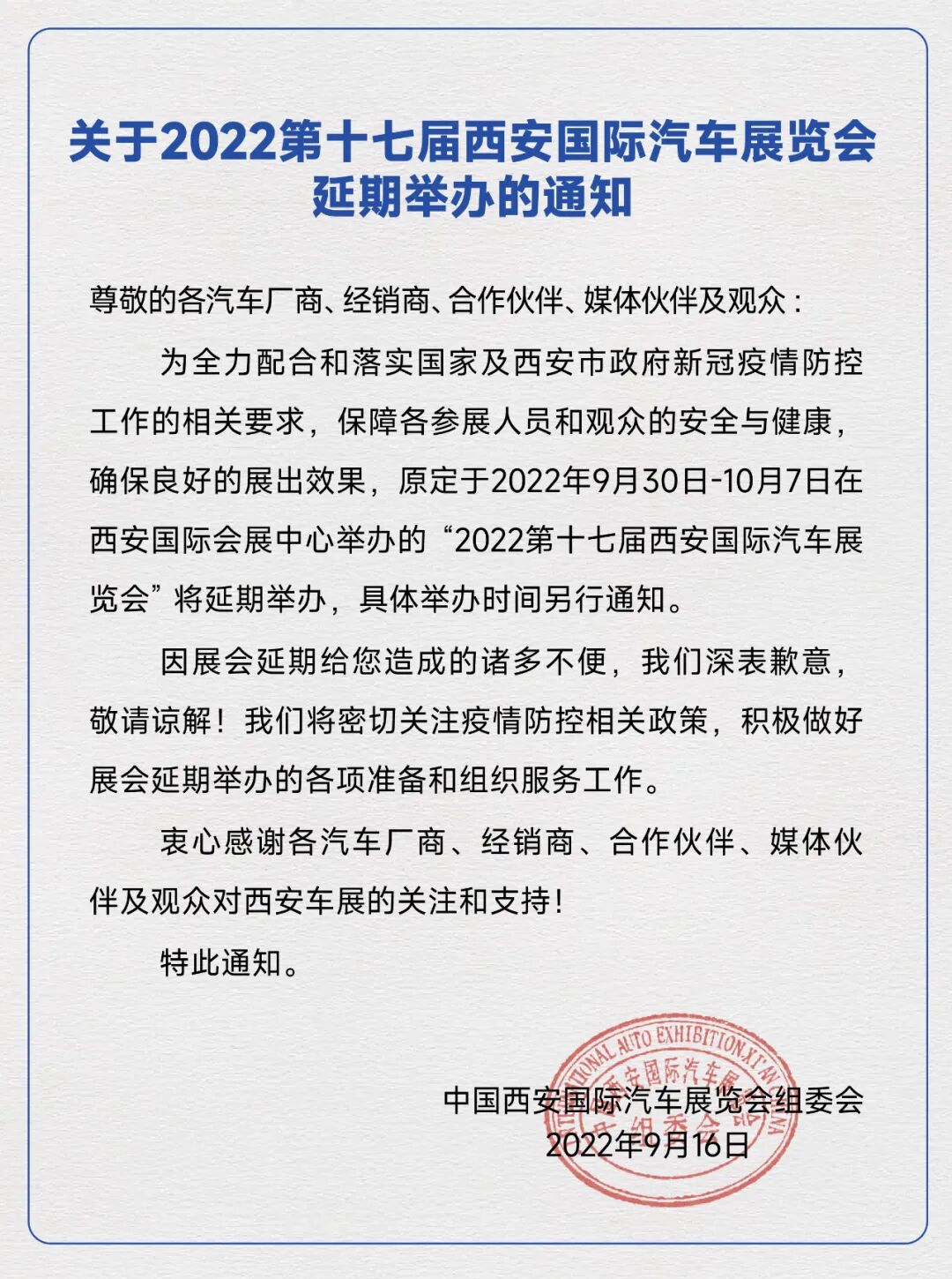 关于2022第十七届西安国际汽车展览会延期举办的通知
