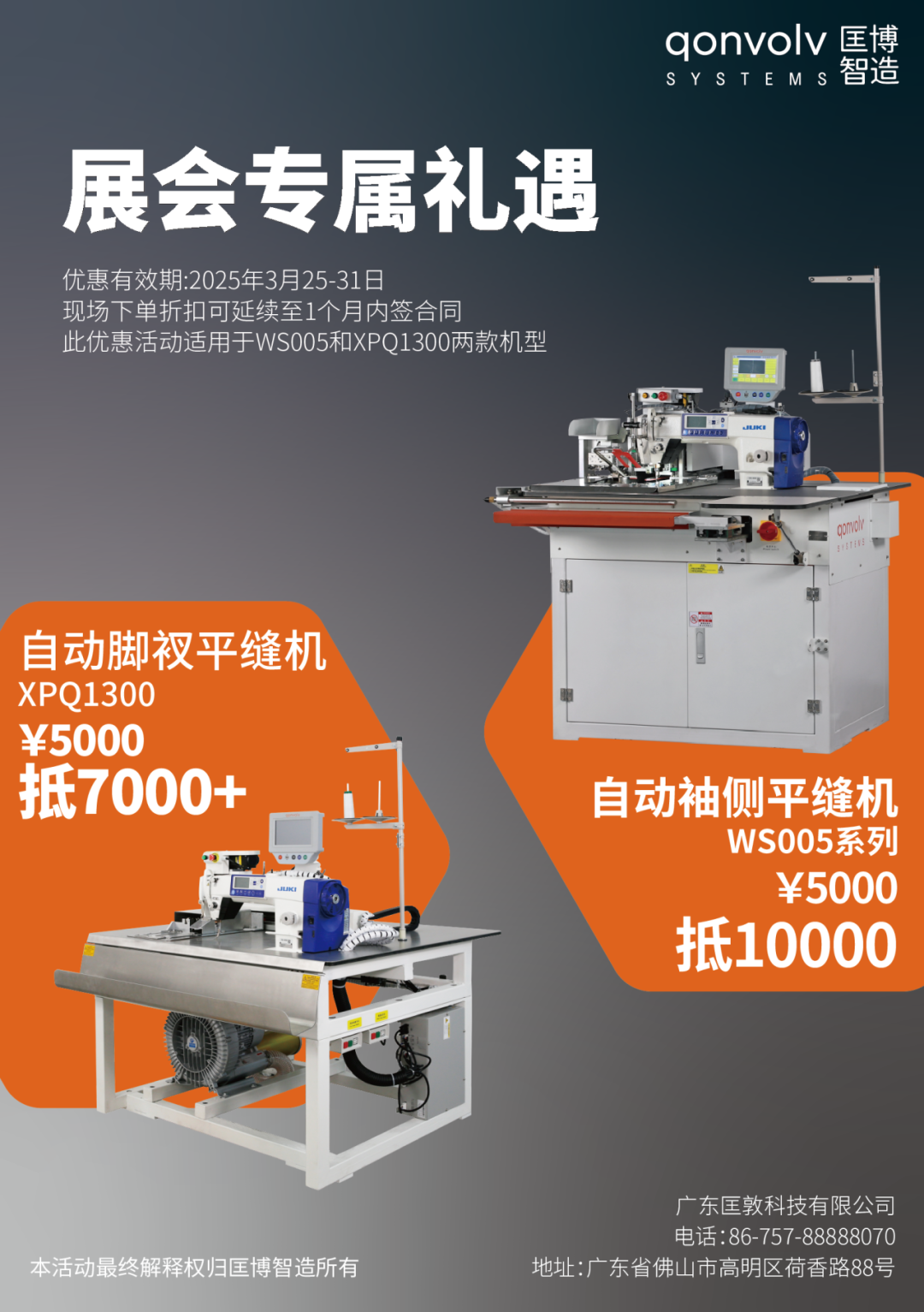 展会期间,匡博智造推出限时优惠活动,预付5000元,自动袖侧平缝机(WS005系列)、自动脚衩平缝机(XPQ1300)两款机型即享5%优惠,只为让我们的客户用更少的钱,体验性能卓越的设备。