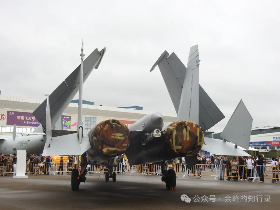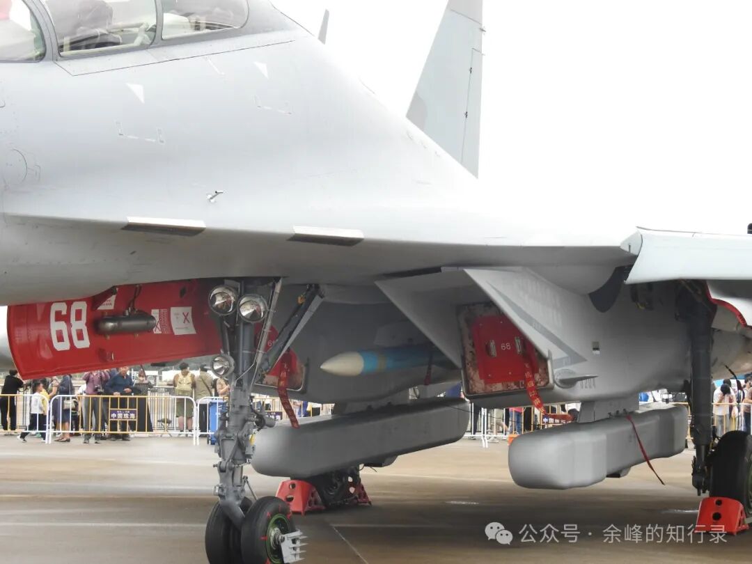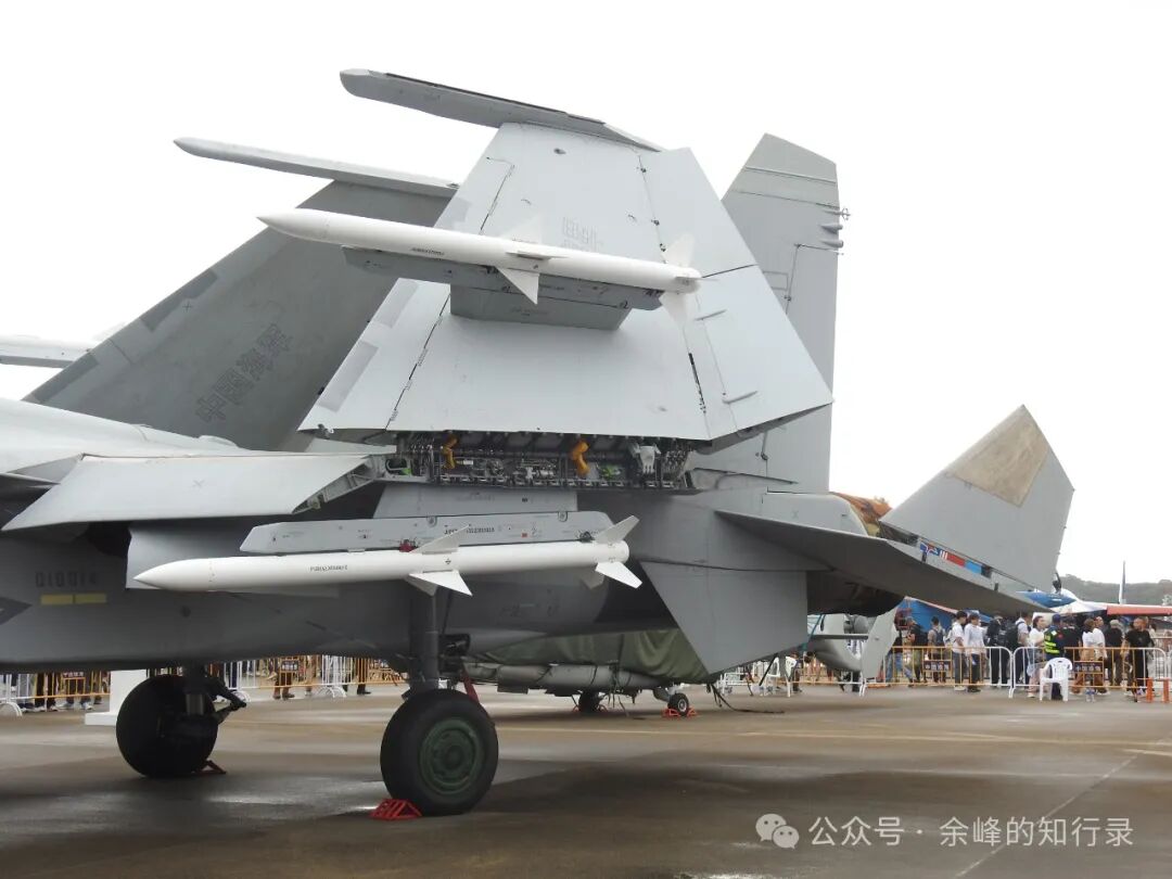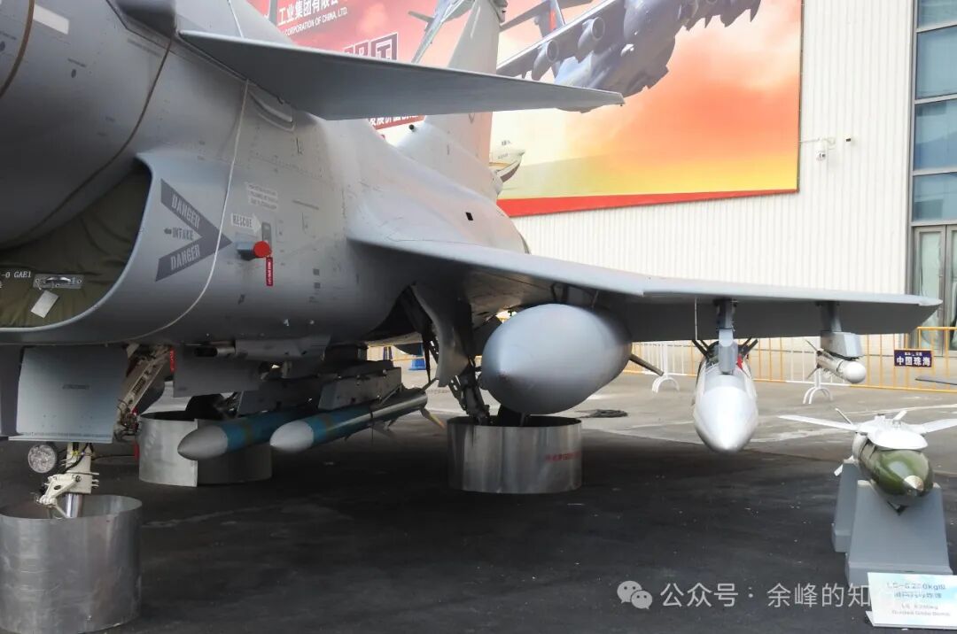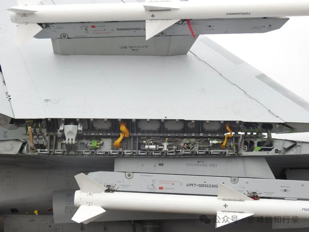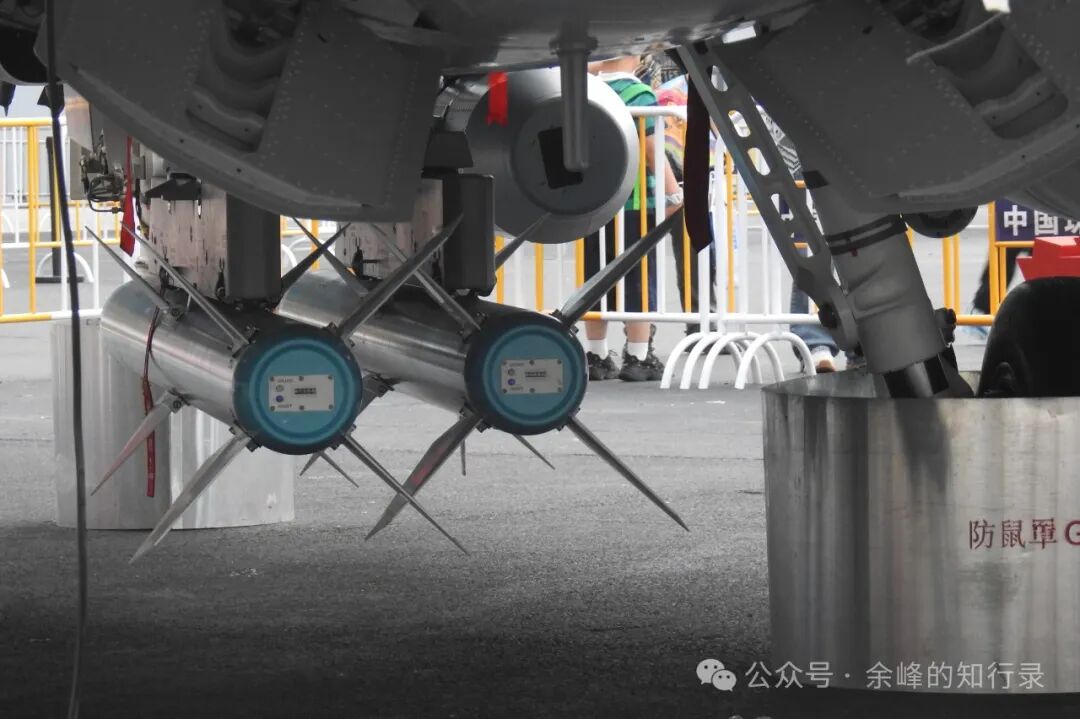 歼-10CE的观后总结 | 现场展出的歼-10CE武德充沛,在保持原能力的同时,还极大加强了对地打击能力。因为腹下原本常用来挂载副油箱的空间被替换成两联的超视距空空导弹挂架,以及三联挂架的使用,歼-10的多用途性能得到进一步释放。翼下挂载的武器包含1枚反舰导弹、2枚近距空空格斗弹、2枚超视距空空导弹、3枚制导炸弹,以及1个光电瞄准吊舱和2个副油箱;其它可搭配的炸弹还有航空制导炸弹、集束炸弹、增程式集束炸弹、激光制导炸弹和滑翔制导套件改装的普通航空炸弹