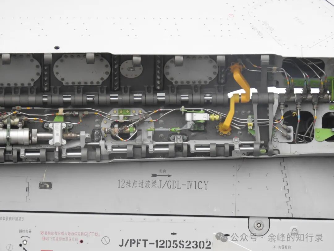 歼-15T舰载战斗机折叠结构特写 | 机翼设计采用了多个连接点,这些连接点由主销、副销和锁定机构组成,确保了机翼在飞行时的稳定性和强度,液压管路设计十分精细,能准确控制机翼状态