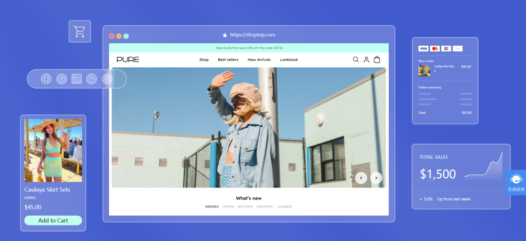 借助 30+ 免费、可自定义的网站模板,本土化1V1运营指导服务,15分钟快速搭建网站;Shoptop免费插件库,定期迭代升级,满足多样化网站设计需求,给用户优质购物体验。