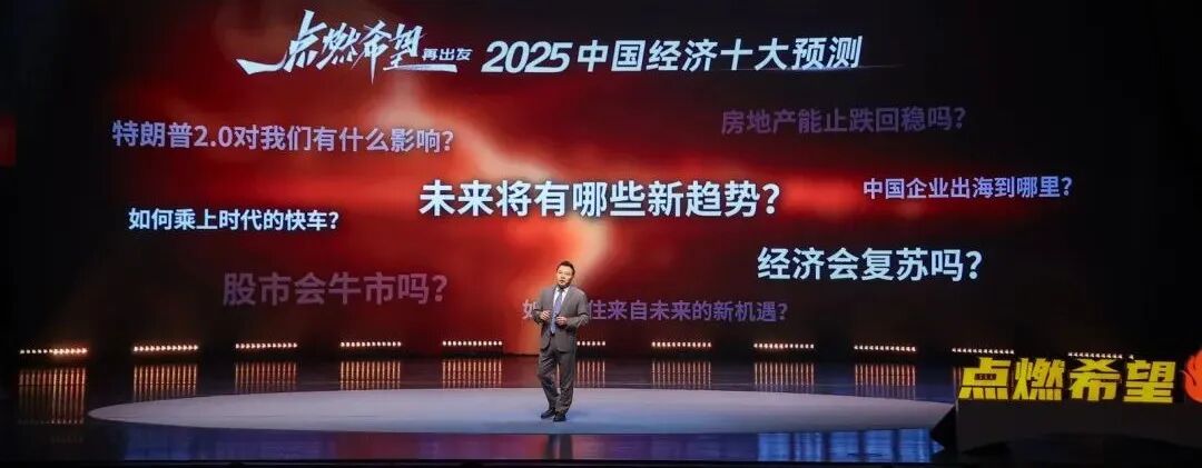 最后,让我们来总结一下2025中国经济的十大预测:第一大预测 这是一个新周期、新时代,顺应新趋势,把握新机遇,勇敢再出发,一切发生皆有利于我。第二大预测 全球开启降息周期,特朗普2.0搅动全球,世界经济增长分化,制度经济学为各国发展带来希望。第三大预测 第四次科技革命如火如荼,人工智能、新能源、商业航天、低空经济、生物制造出现重大突破。第四大预测 中国拉开大规模刺激经济的序幕,提振信心,全力拼经济,大力发展新基建、新质生产力。第五大预测 企业从出口到出海,从红海到蓝海,全球化本质上是本土化,踏上征程,走向世界。第六大预测人工智能迎来寒武纪大爆炸,图像识别、人形机器人、AI助手、AI消费电子、AI科研超级应用呼之欲出。第七大预测 新能源革命加速前进,汽车出海、智能驾驶、固态电池、储能、氢能酝酿新机遇。第八大预测 消费回归以人为本,线下零售重拾人间烟火,兴趣消费打动年轻人,文化消费、国潮出海风头正劲。第九大预测 迈向后房地产时代,促进市场止跌回稳,调整和分化是未来主要趋势,人口向都市圈城市群集聚。第十大预测 应对老龄化少子化,抓住银发经济机遇,提振生育率,重视儿童早期发展。女士们,先生们!我们今天的演讲马上就要结束了。我们经历过无数次的战争、危机、瘟疫和萧条,在人类社会的至暗时刻,总有人站出来建立愿景,经营希望,点燃未来,激发勇气。那些未能打败你的,都将使你更强大。是的,过去这些年,我们非常不容易。但是,无论遇到多大的困难,一定要勇敢前行,不要让一时的迷茫,遮盖你心中的梦想。唯有长期乐观主义才能穿越周期。你每天的努力,都将让你走得更远。人生没有白走的路,每一步都算数。展望未来,我们深信,正心正念,坚持做长期正确的事,最终就会开花结果。    我们深信,悲观者正确,乐观者前行,世界终将属于长期乐观主义者!朋友们!新的一年即将到来,新周期,新时代,新趋势,新机遇!在这个关键时刻,让我们一起点燃希望,照亮未来!让我们一起为自己加油,为梦想而战!