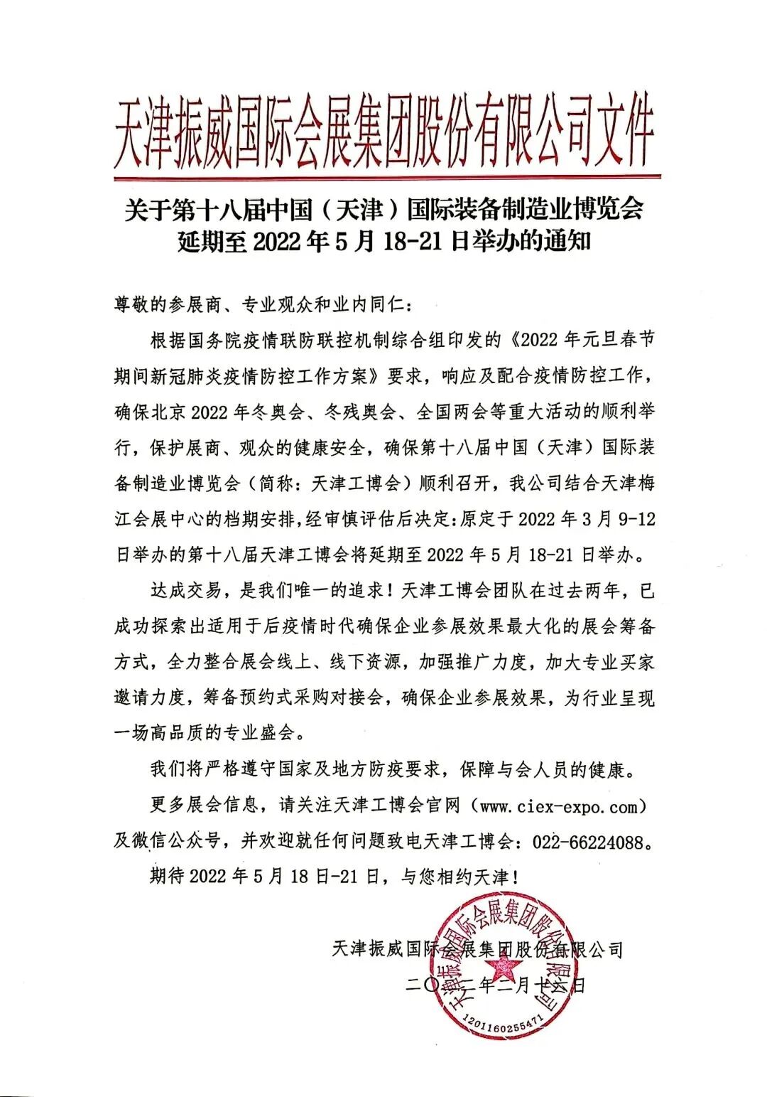 根据国务院疫情联防联控机制综合组印发的《2022年元旦春节期间新冠肺炎疫情防控工作方案》要求,响应及配合疫情防控工作,确保北京2022年冬奥会、冬残奥会、全国两会等重大活动的顺利举行,保护展商、观众的健康安全,确保第十八届中国(天津)国际装备制造业博览会(简称:天津工博会)顺利召开,我公司结合天津梅江会展中心的档期安排,经审慎评估后决定:原定于2022年3月9-12日举办的第十八届天津工博会将延期至2022年5月18-21日举办。