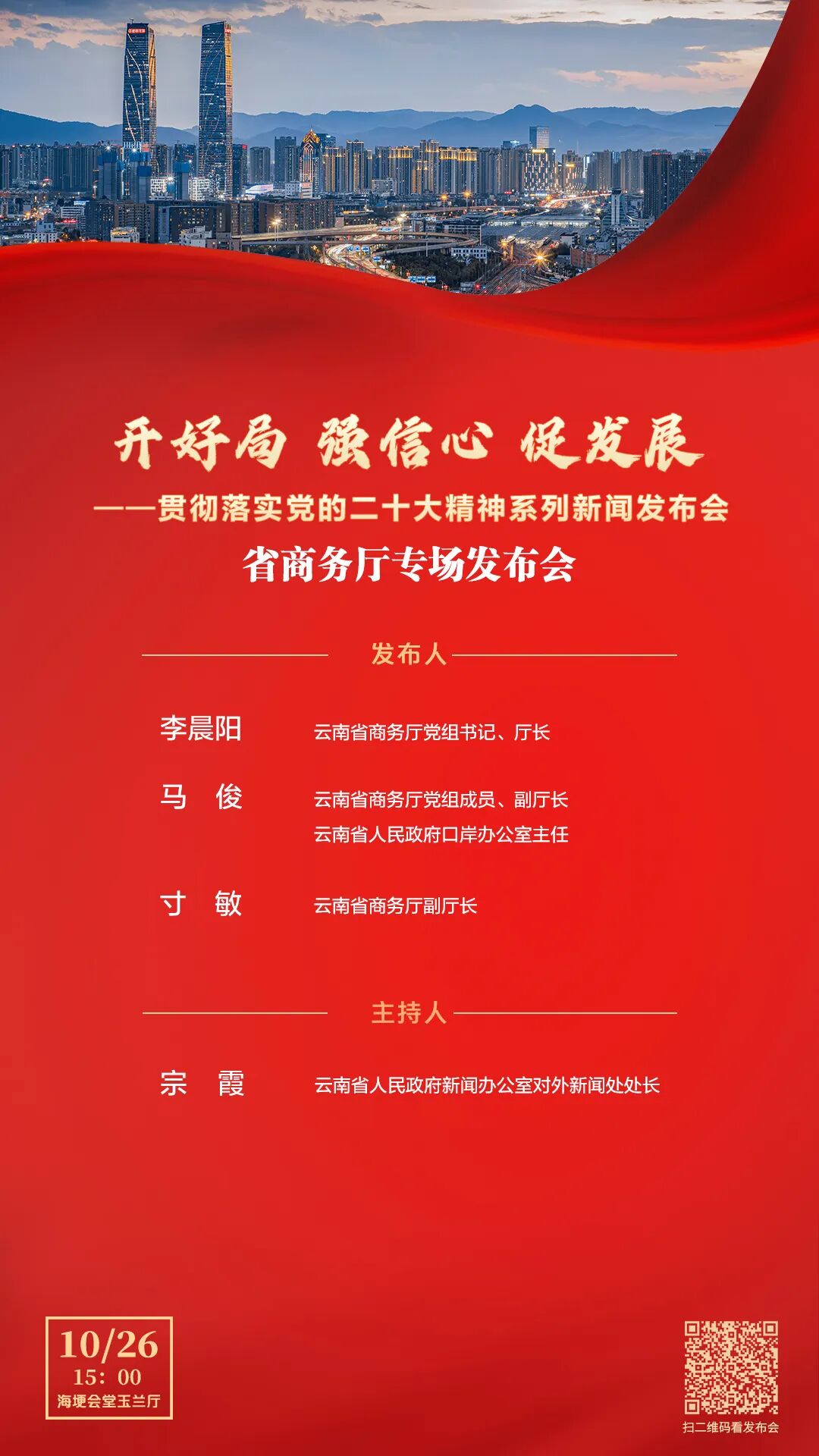10月26日下午,云南省人民政府新闻办公室在海埂会堂举行“开好局、强信心、促发展——贯彻落实党的二十大精神”系列新闻发布会·省商务厅专场发布会,介绍相关情况并回答记者提问。