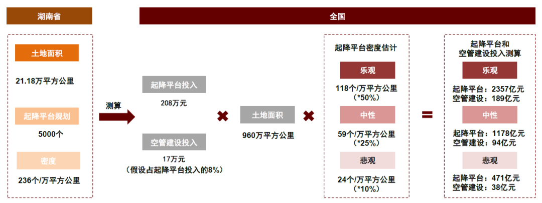 参考湖南省的起降平台布局密度,乐观/中性/悲观情况下假设我国全国起降平台布局密度达湖南省的50%/25%/10%,以此测算我国2024-2030未来7年起降平台基础设施投入乐观/中性/悲观情况下分别为2357/1178/471亿元,空管建设投入分别为189/94/38亿元。