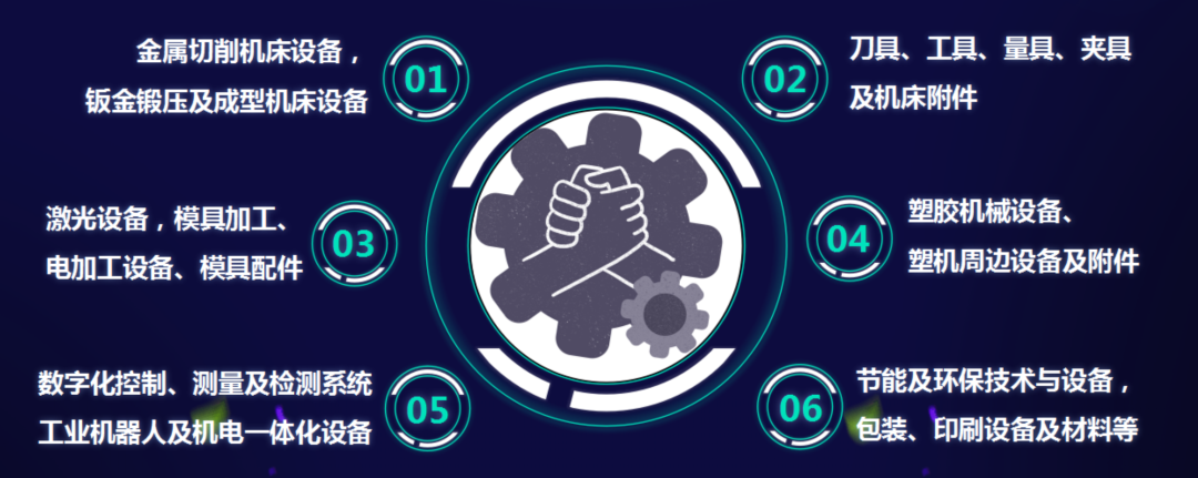 参展展品范围:金属切削机床;金属成形机床;特种加工机床、激光加工设备、增材制造及专用设备;制造单元/系统、工业机器人及自动化设备;铸造、热处理、注塑、清洗机等周边设备;功能部件及附件;数控系统、数显装置、机床电器;磨料磨具、超硬材料及制品、涂附磨具;刀具、工夹具及相关产品;检验和测量设备;工业物联网、软件、标准、协议服务;木竹加工机床;信息咨询、工程服务等