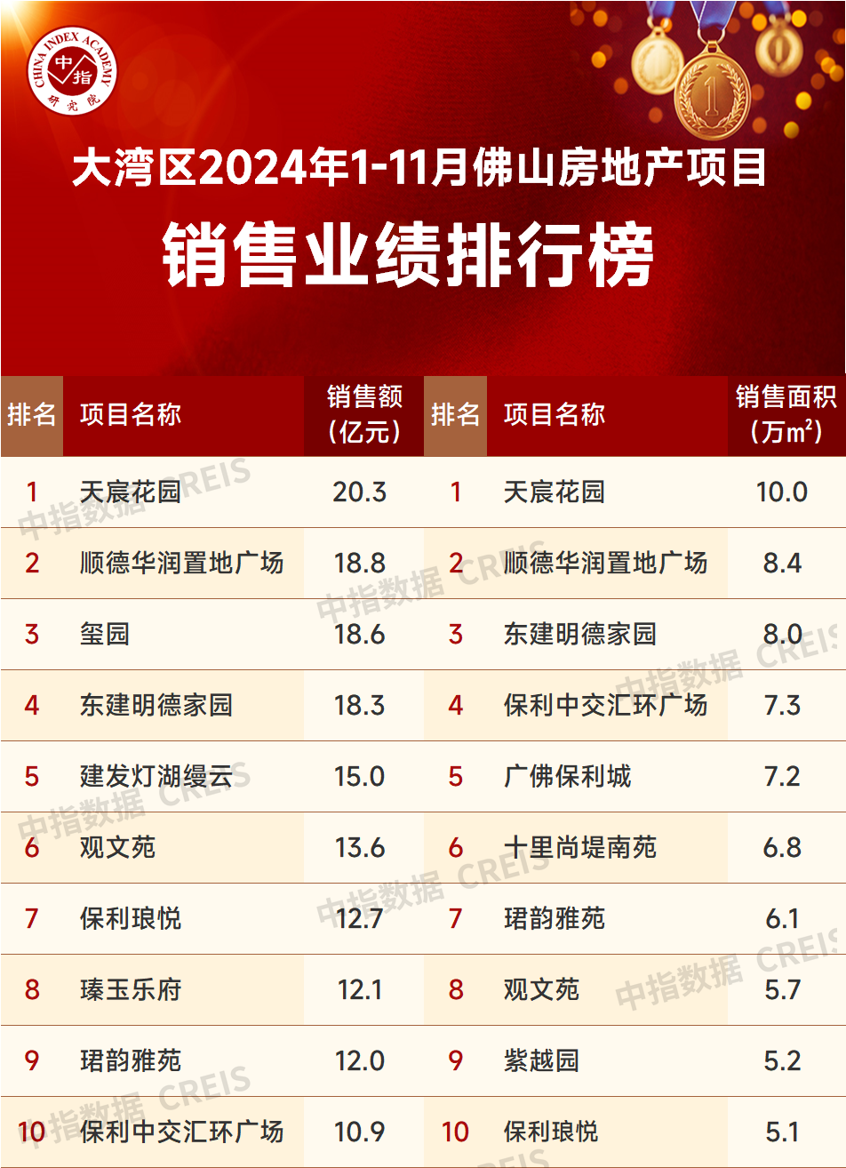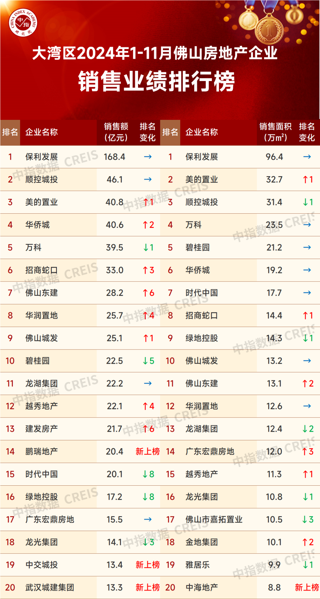 特别声明:房地产企业销售数据统计是以2024年1月1日—11月27日期间销售的商品房为统计口径,主要依据中指数据CREIS(点击查看)在佛山市的销售监测数据,对于监测不全的项目数据,由企业提供相关文件并严格审核,也纳入统计范围。本报告仅供参考,我方不对使用报告及其内容所引发的任何直接或间接损失承担责任。✦ 榜单点评