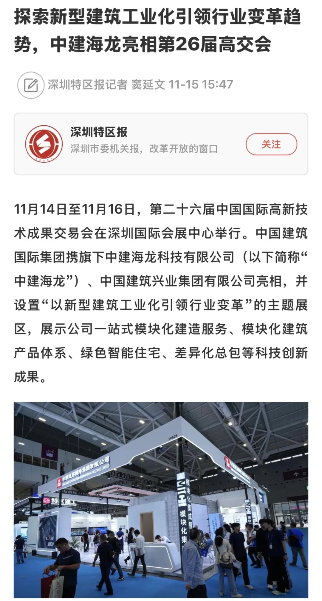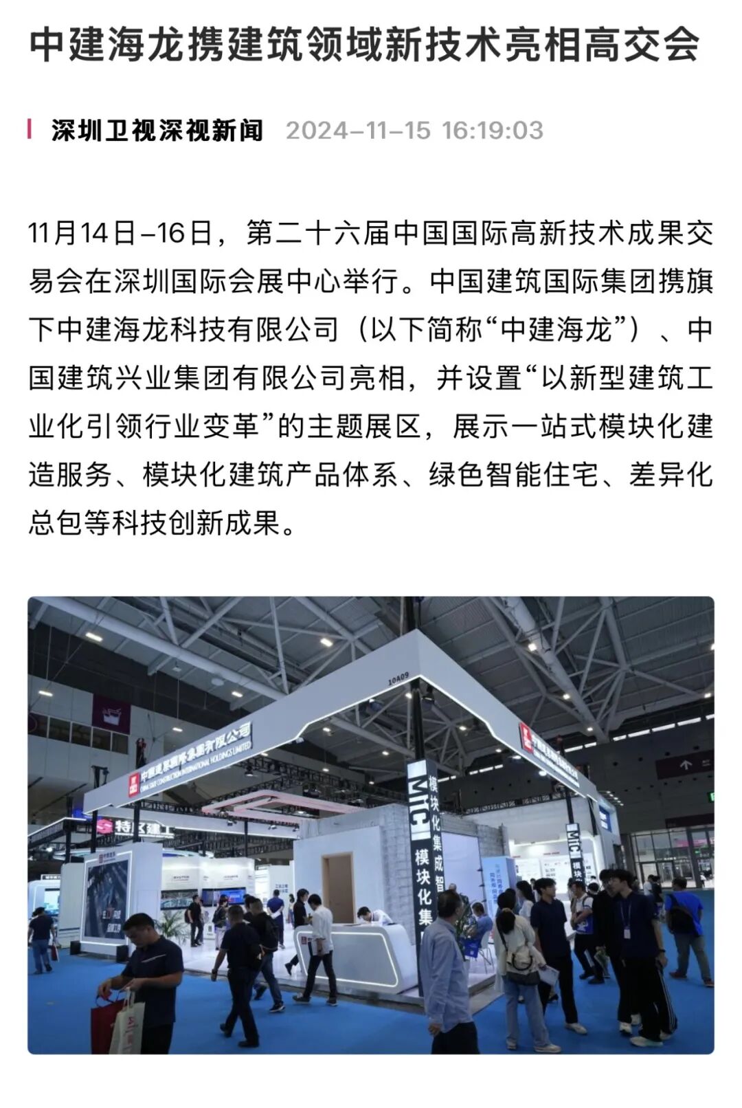 2024年11月14日至11月16日,第二十六届中国国际高新技术成果交易会在深圳国际会展中心举行。中国建筑国际集团旗下中建海龙科技有限公司(以下简称“中建海龙”)亮相,设置“以新型建筑工业化引领行业变革”的主题展区,展示公司最新科技创新成果。