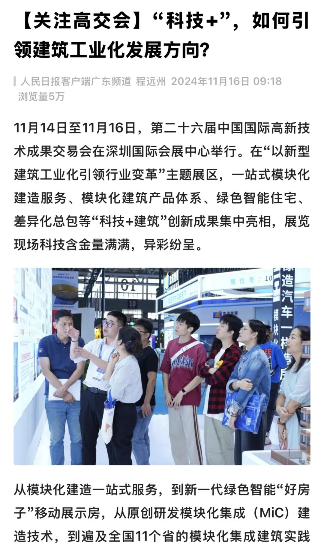 展厅现场,不仅展示了模块化集成(MiC)建造技术、复杂玻璃幕墙制造与施工技术、BIPV光伏建筑一体化生产施工技术、C-SMART智慧工地管理平台等新型建筑工业化科技产品及一体化管理模式,还将“科技满满”的项目模型和模块化样板房搬进了展厅,让观众身临其境体验建筑与科技的完美融合,吸引众多参观者,热闹非凡。