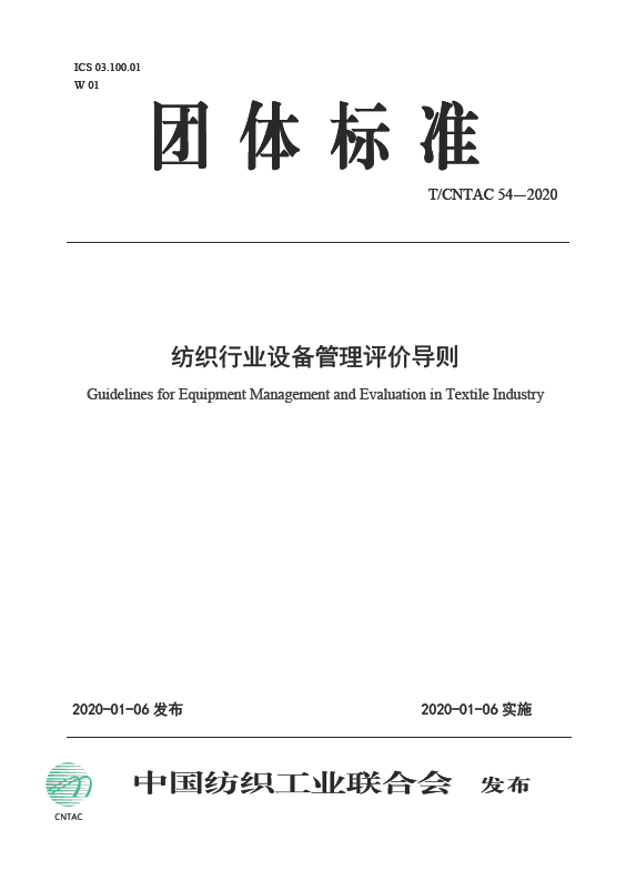 由中国纺织工业联合会组织编写的《纺织设备管理评价导则》团体标准已于2020年1月6日正式发布并实施。《纺织设备管理评价导则》规定了设备管理评价技术要求,建立了具有纺织行业特点的设备管理评价体系,评价要求提出了考量设备管理制度建设的定量指标及定性要求,突出了数字化、信息化、智能化、知识管理等评价要点,评价结果以“管理成熟度”表示,便于企业在行业内横向对标。