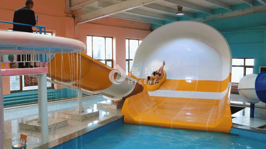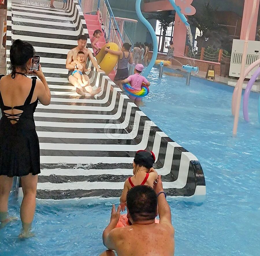 充满家庭互动趣味性,可两人一起,让人出现轻微失重的感觉,然后在惯性的作用下,冲上滑梯对面,最后徐徐滑向水池。