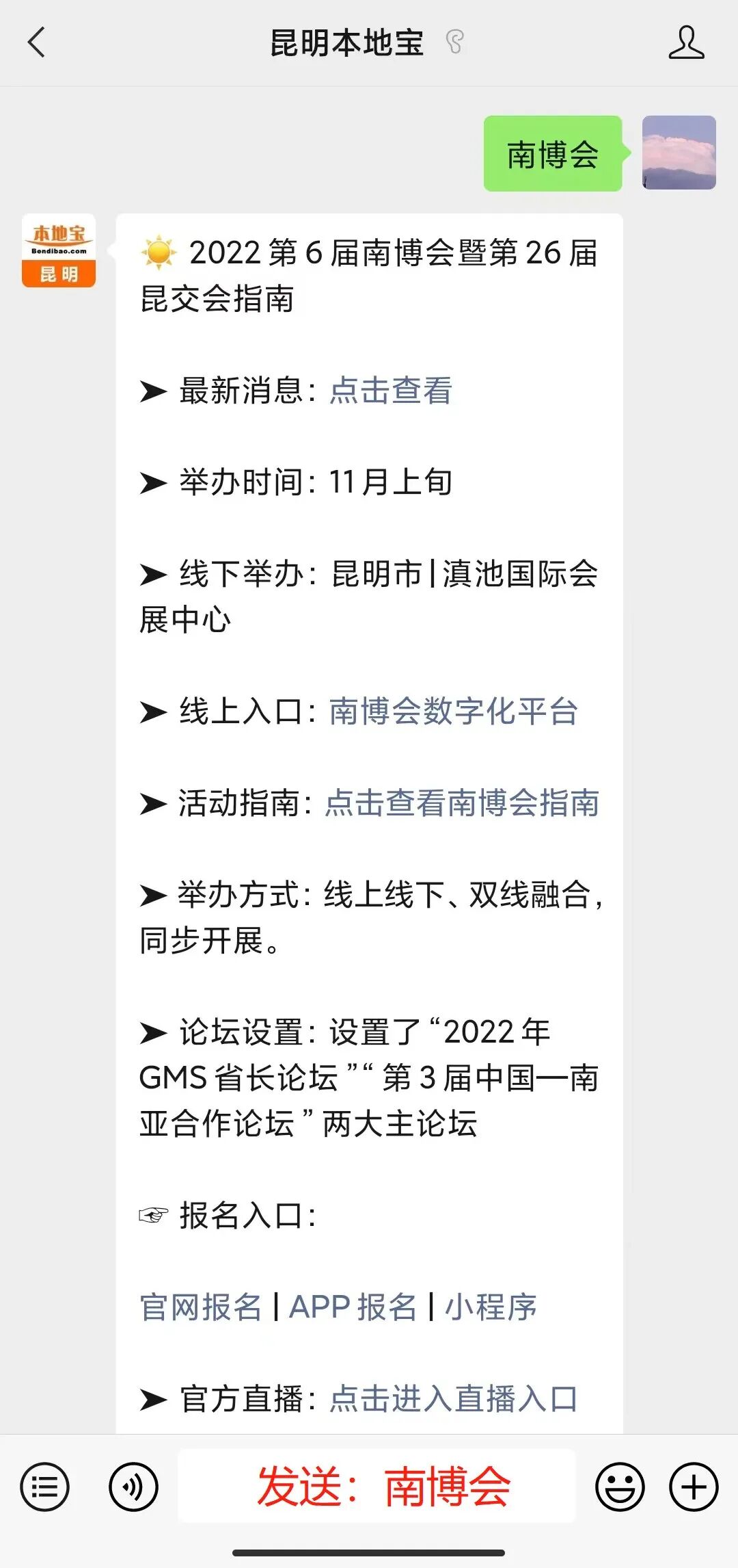 昆宝提醒:点击下方卡片,关注【昆明本地宝】微信公众号,在聊天对话框发送【南博会】,即可获取南博会最新消息。