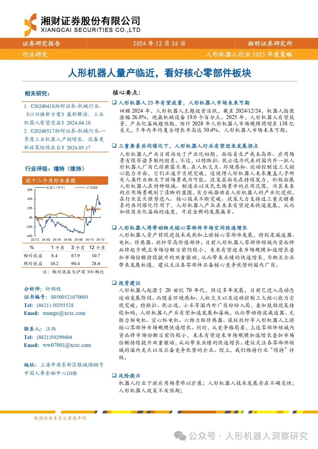 文章来源:湘财证券《人形机器人行业2025年度策略:人形机器人量产临近,看好核心零部件板块》