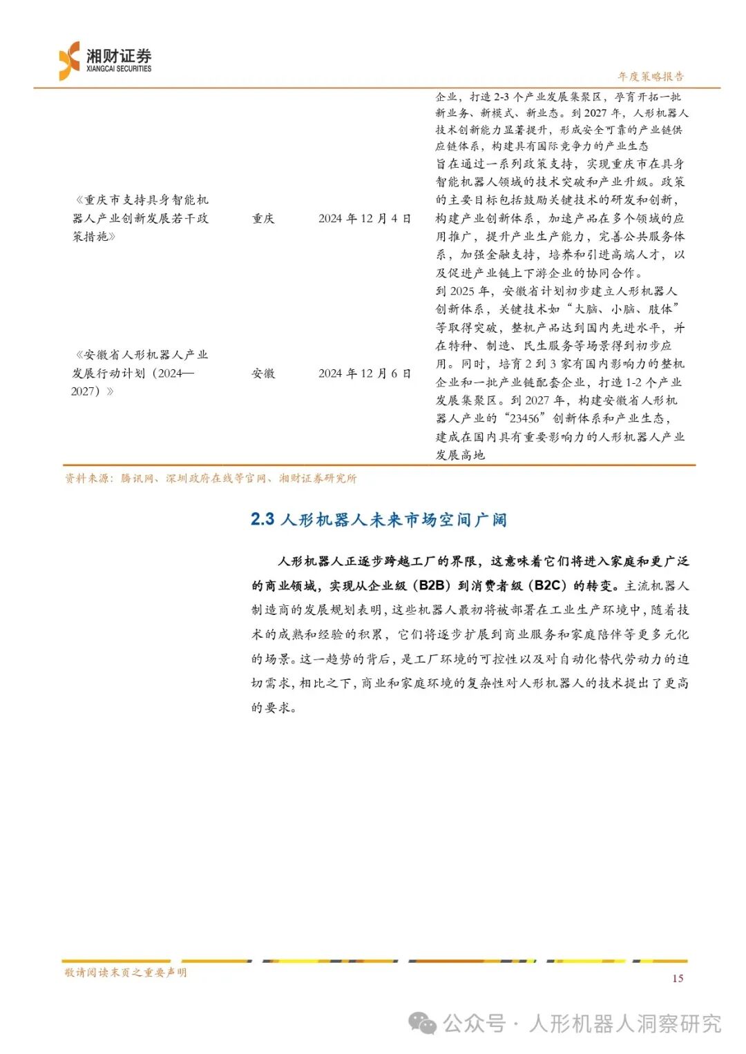 人形机器人产业目前尚处于产业化初期,面临着生产成本高昂、应用场 景有限等诸多制约因素。不过以特斯拉、优必选为代表的国内外一批人 形机器人厂商已经崭露头角。在人机交互、环境感知、运动控制这三大核心能力方面,它们正逐步实现突破,这使得人形机器人未来覆盖几乎所有人类作业相关下游场景成为可能。政策层面也在持续发力,积极拓展人形机器人在特种领域、制造业以及民生场景中的应用范围,为其未来的应用场景规划了清晰的蓝图,有力地推动着人形机器人的产业化进程。在行业巨头强势进入、核心技术不断突破、政策大力支持这三重关键要素的共同催化作用下,人形机器人产业在未来有望迎来快速发展,从而加快商业化落地的速度,开启全新的发展篇章。人形机器人将带动相关核心零部件市场空间快速增长