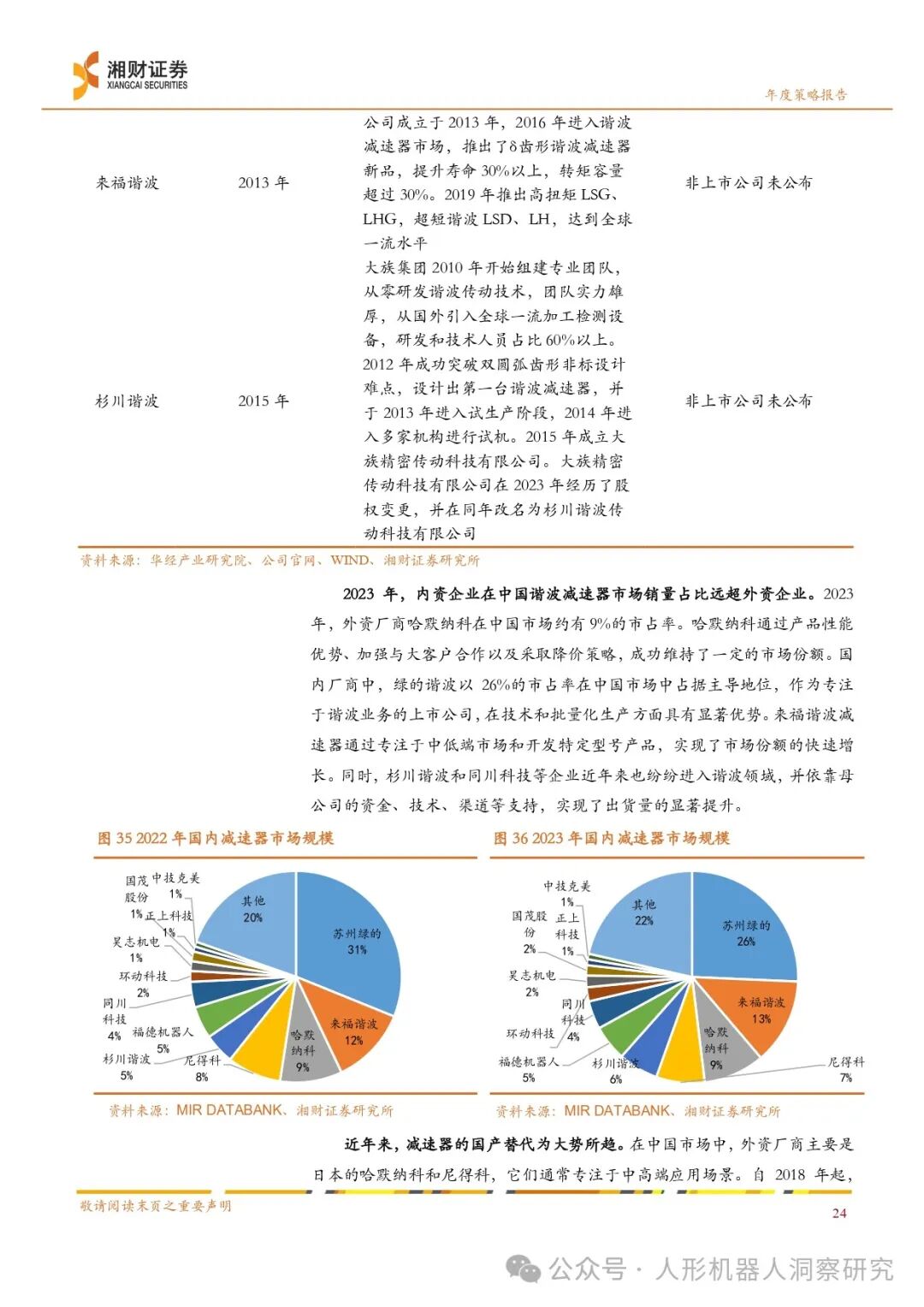 人形机器人量产将促进技术成熟和上游核心零部件发展,特别是减速器、 电机、传感器、丝杆等高价值部件。目前人形机器人零部件领域内资品牌品牌起步晚且市场份额目前仍较小,未来有望迎来市场规模加速增长叠加市场份额持续提升的双重驱动,从而带来业绩的快速增长,为相关企业带来发展机遇。