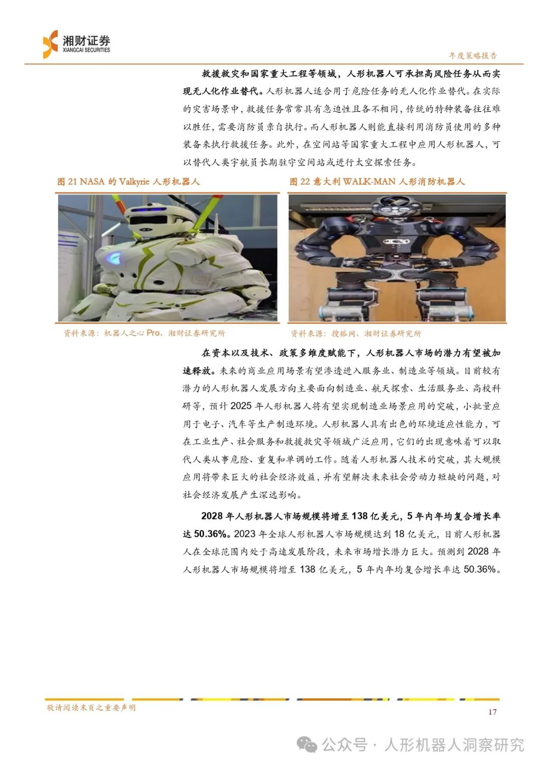 回顾2024年,人形机器人主题投资活跃,截至2024/12/24,机器人指数 涨幅26.8%,跑赢机械设备19.0个百分点。2025年人形机器人有望放量,产业化落地超预期,预计2028年人形机器人市场规模将增至138亿 美元,5年内年均复合增长率高达50.4%,人形机器人市场未来可期。三重要素共同催化下,人形机器人行业有望迎来发展拐点