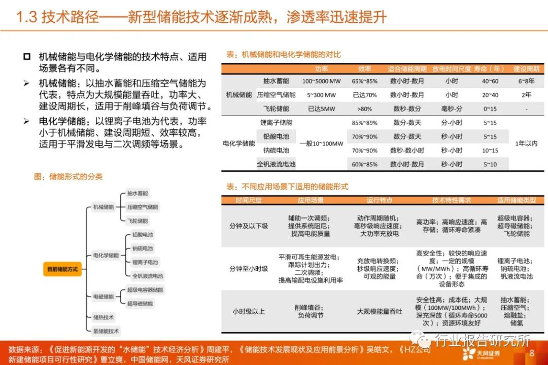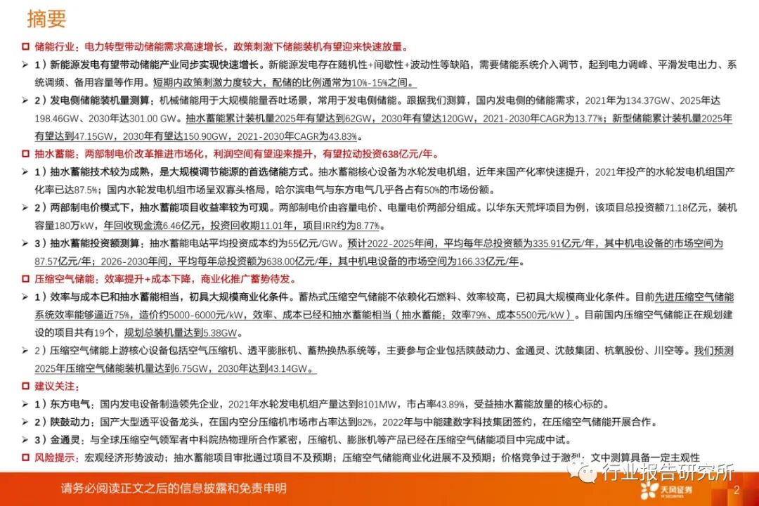 1)效率与成本已和抽水蓄能相当,初具大规模商业化条件。蓄热式压缩空气储能不依赖化石燃料、效率较高,已初具大规模商业化条件。目前先进压缩空气储能系统效率能够逼近75%,造价约5000-6000元/kW,效率、成本已经和抽水蓄能相当(抽水蓄能:效率79%、成本5500元/kW)。目前国内压缩空气储能正在规划建设的项目共有19个,规划总装机量达到5.38GW。2)压缩空气储能上游核心设备包括空气压缩机、透平膨胀机、蓄热换热系统等,主要参与企业包括陕鼓动力、金通灵、沈鼓集团、杭氧股份、川空等。我们预测2025年压缩空气储能装机量达到6.75GW,2030年达到43.14GW。