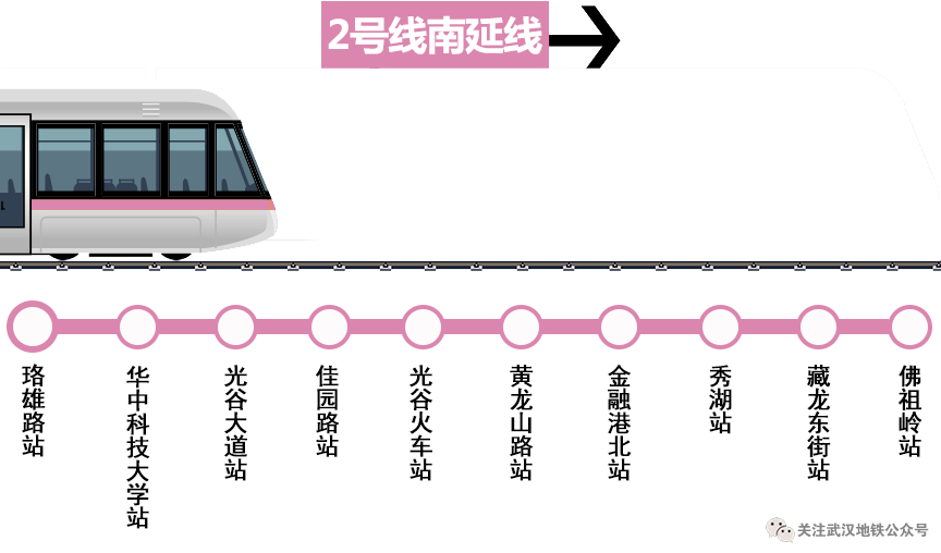 地铁2号线南延线由东湖高新区与武汉地铁集团合作共建。线路全长13.2公里,起于光谷广场站,终点至佛祖岭站,设站10座。沿线途经珞喻路、佳园路、黄龙山路、光谷大道、高新六路,覆盖光谷步行街、华中科技大学、光谷金融港、武汉大学人民医院等人流及企业聚集区,还连接了光谷火车站等大型客运交通枢纽,实现城市内外交通的有效衔接。